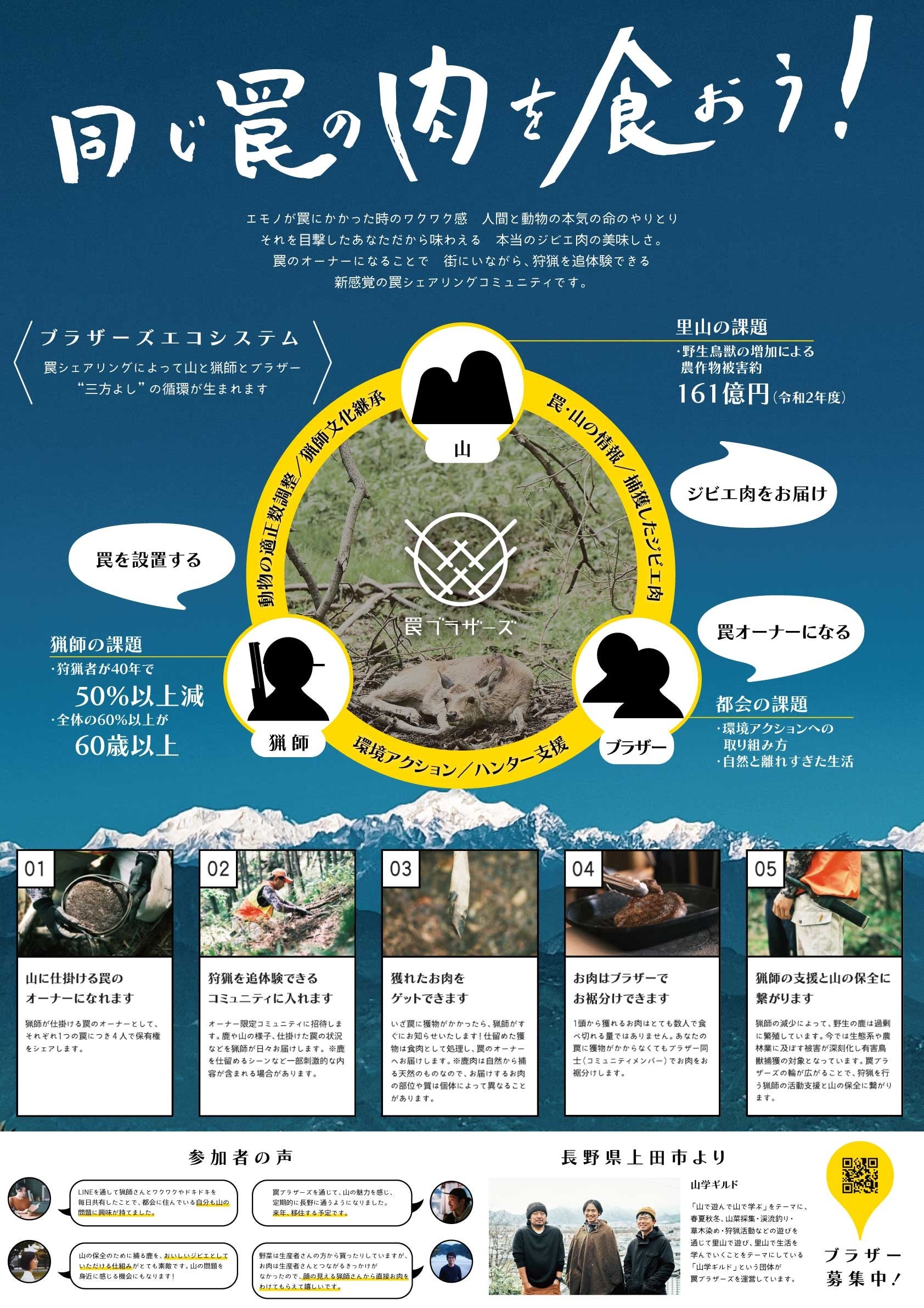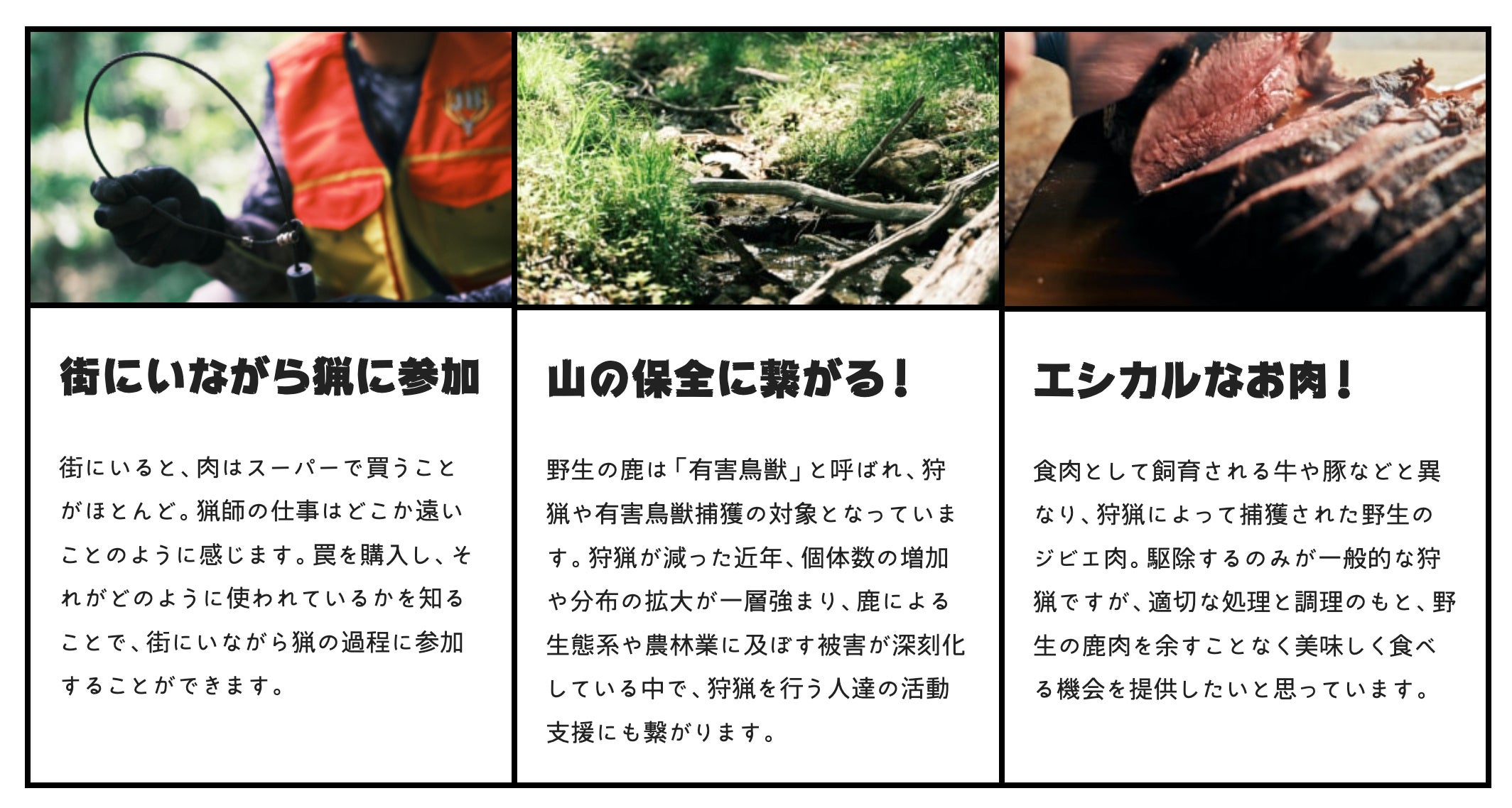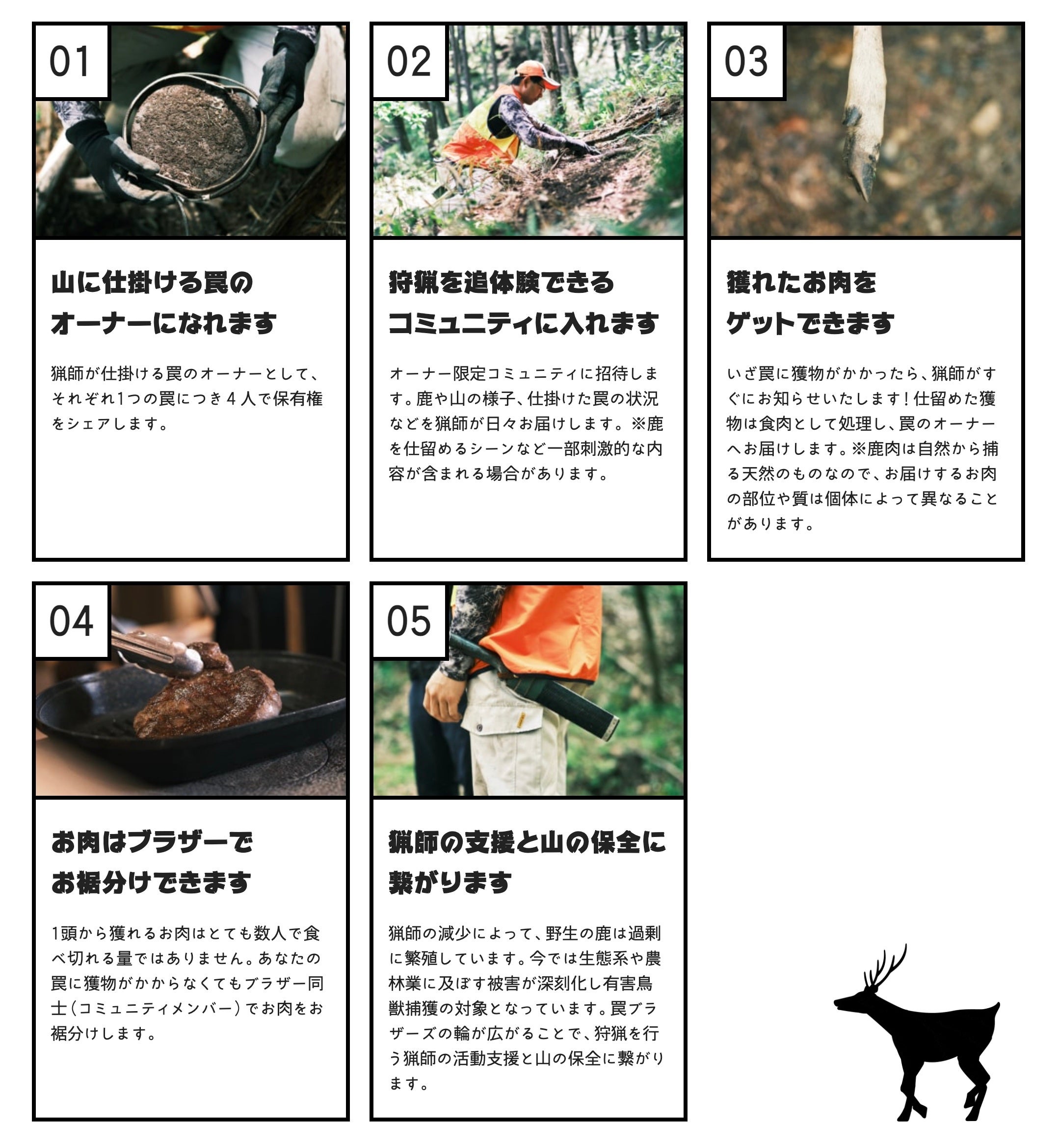 「罠ブラザーズ」は単にジビエ肉を購入できるサービスではなく、罠シェアリングによって狩猟からジビエ肉を”いただく” までの過程を追体験できるサービスです。