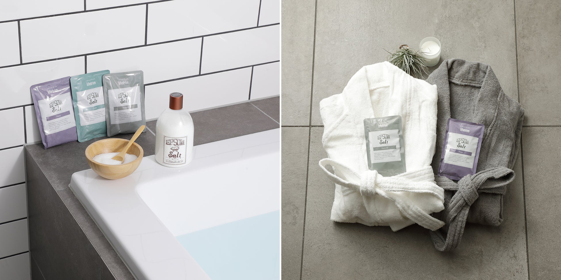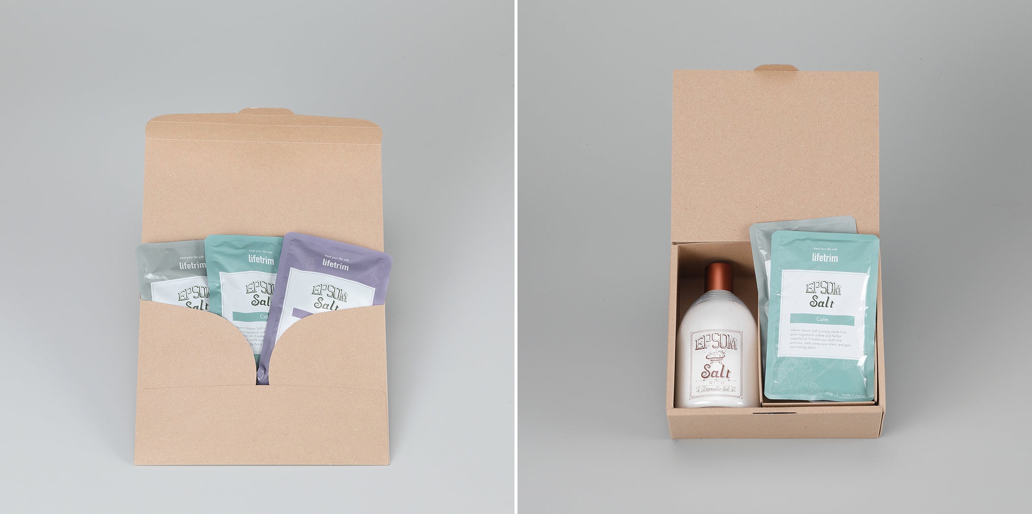 ●エプソムソルトのパウチが3つ⼊ったコンパクトなギフトセット。(写真右)