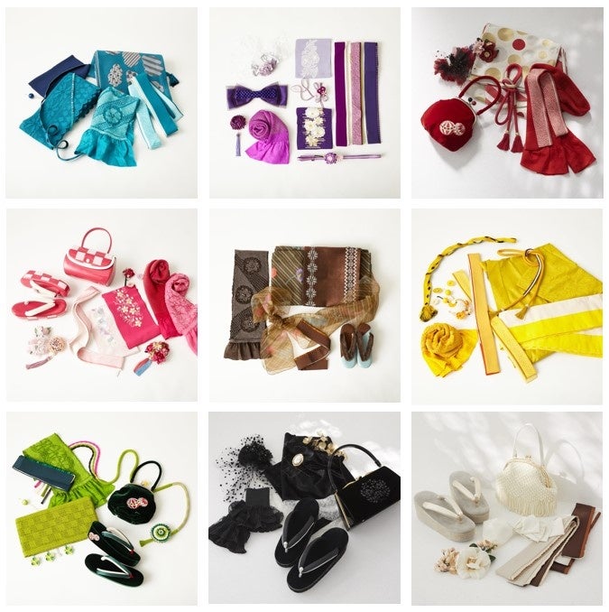 個性を大切にする女性に、“オリジナルテキスタイル”で、きものを始めるきっかけを提案するブランド「ふりふ」より、ブルー、パープル、レッド、ピンク、ブラウン、イエロー、グリーン、ブラック、ホワイトの9色ごとにまとめたコーディネートをご提案しました。