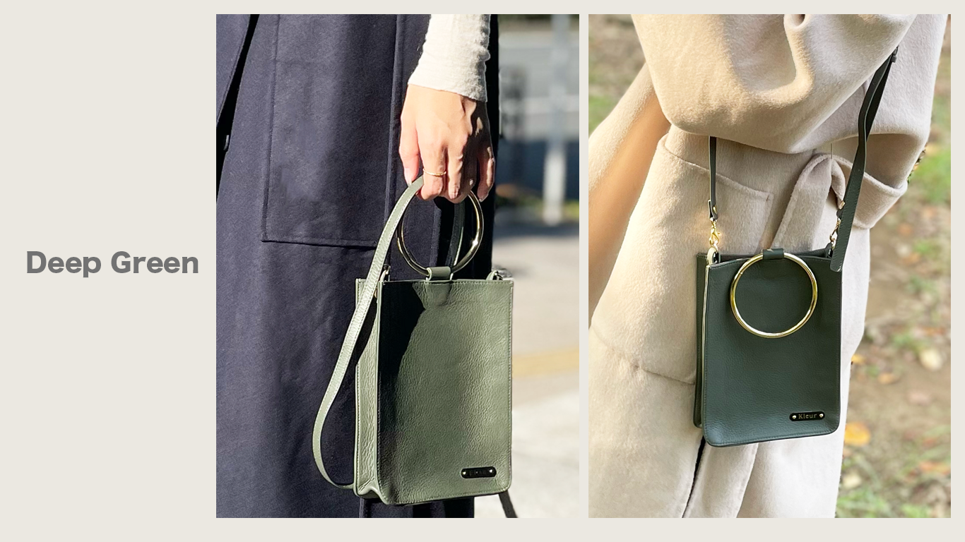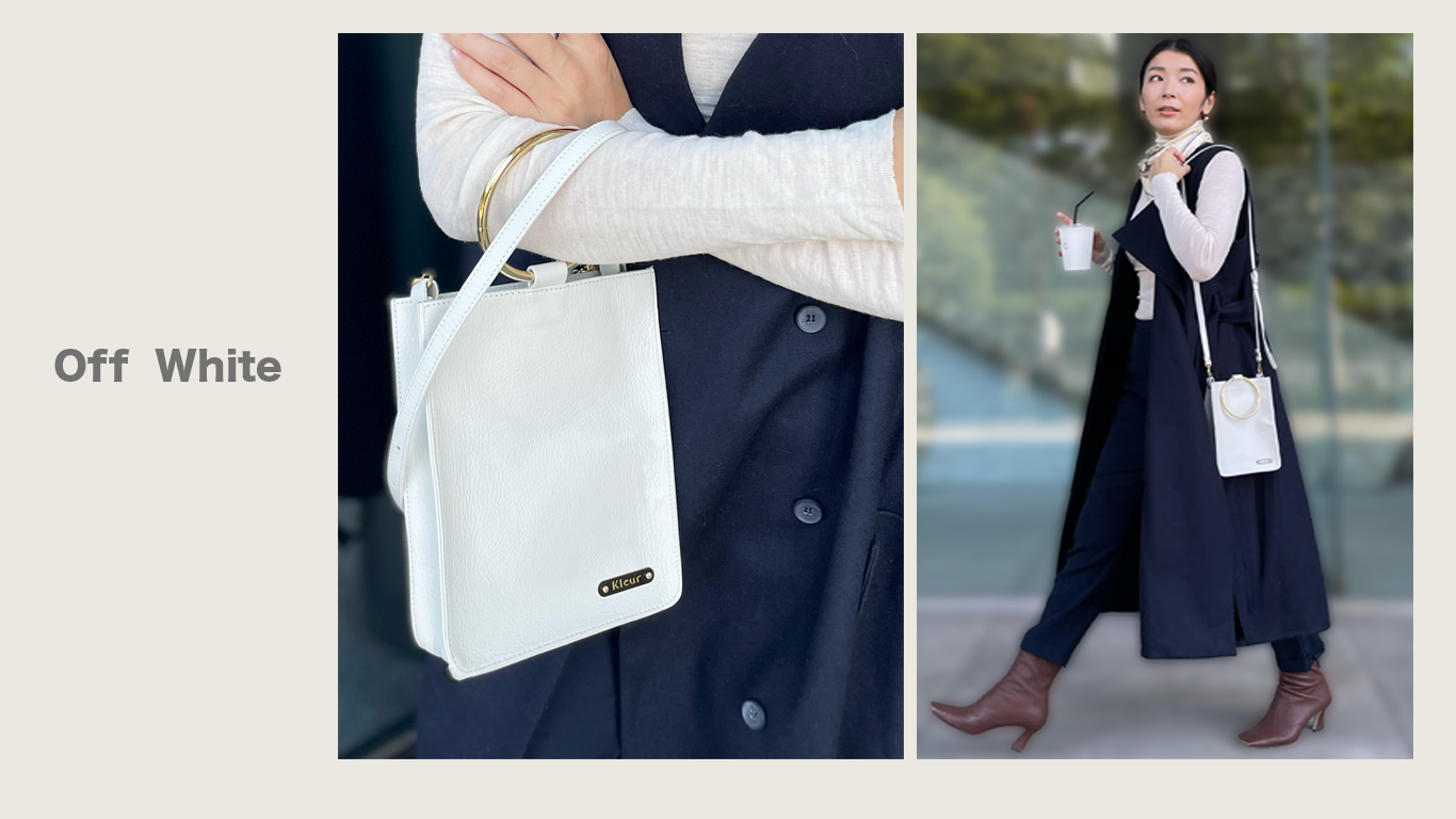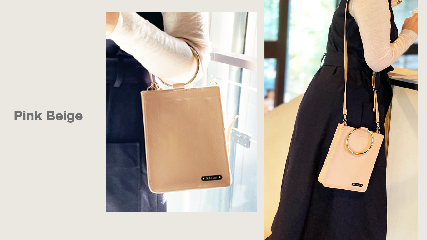 ブレスレットバッグとは、ショルダーにしたときにデザインアクセントに使用しているリングが、腕にかけてもブレスレットのようにオシャレにマッチすることから名付けました。