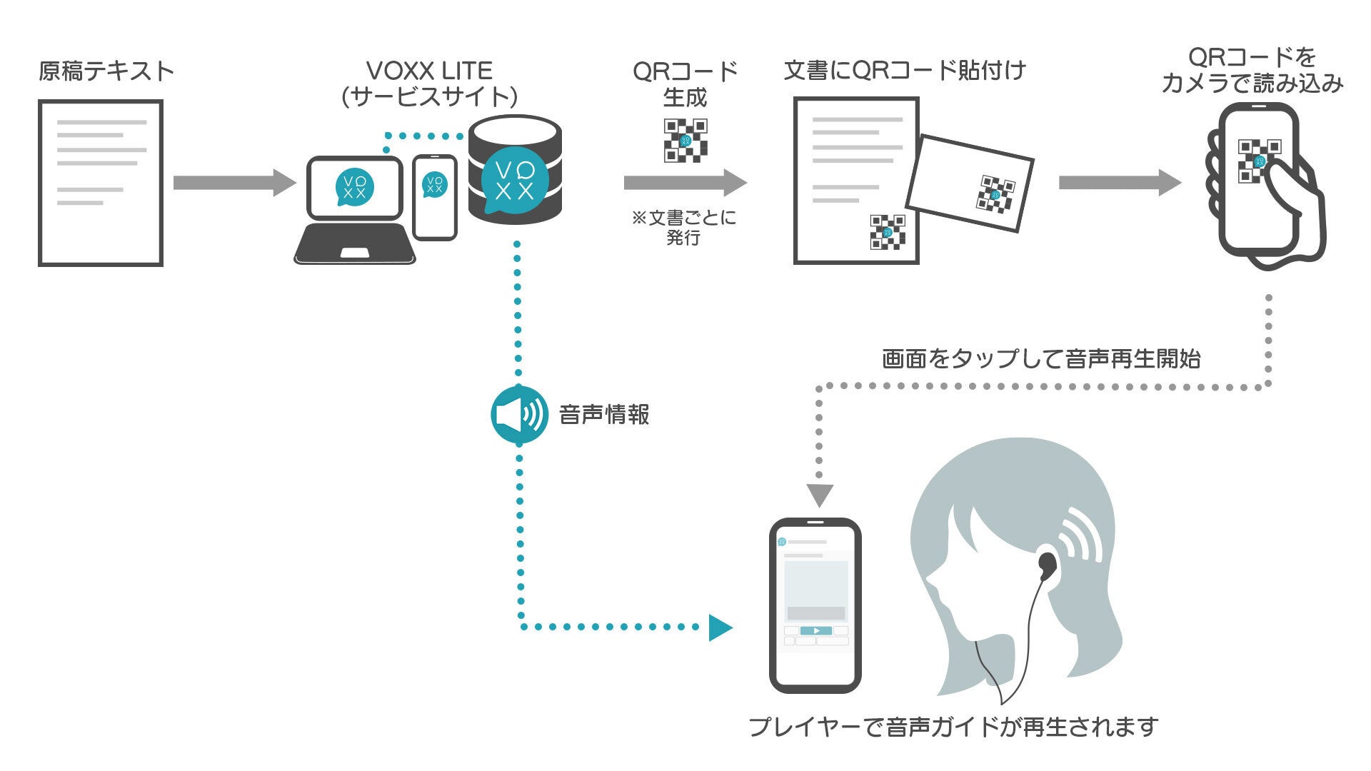 VOXXシリーズの中で「VOXX LITE(ヴォックス・ライト)」は、登録した文書を音声読み上げする、最もシンプルな形のオンライン型のサービスです。文書をサービスサイトに登録して発行されるQRコード*を利用者がスマホのカメラで読み取るとブラウザ上に音声再生プレーヤーが立ち上がり、デジタル音声を聴くことができます。印刷物にQRコードを追加するだけでアプリをインストールすることもなく『しゃべる印刷物』が実現できます。