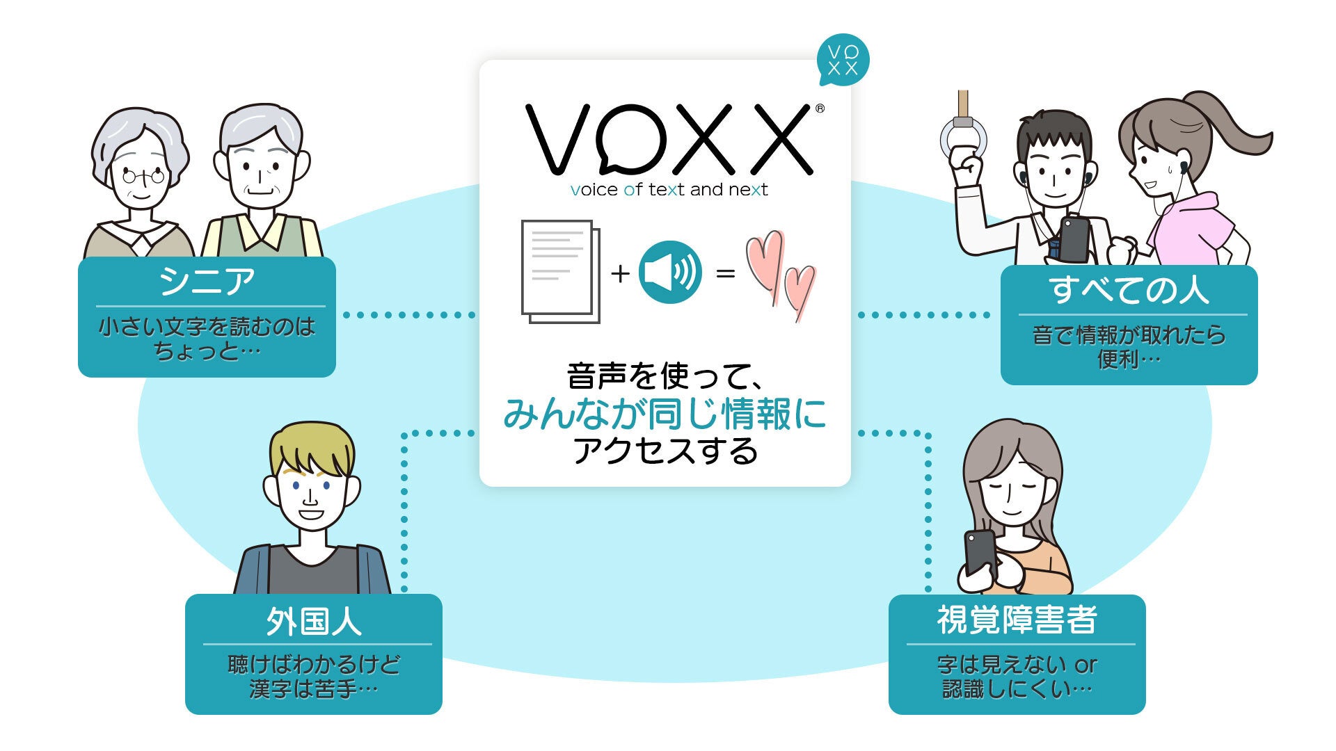 VOXX LITEは世の中に溢れている文書に音声読み上げを添えて、快適な情報へのアクセスをより多くの人々にお届けすることを目的とした、情報バリアフリー化サービスです。VOXX LITEのサービスサイトに文書の原稿を登録するとQRコードが生成されますので、そのQRコードを文書やカードなどに印刷するだけで準備は完了です。音声ガイドを利用する方は、スマホのカメラでQRコードを読み込み、標準のブラウザで表示される音声プレイヤーで音声を再生するだけの簡単な操作で、アプリをインストールする必要はありません。音声プレイヤーには、再生中の音声と同期して原稿の文字も表示されます。音声の種類や再生速度もお好みの設定が可能で、より快適な情報へのアクセスを実現しています。