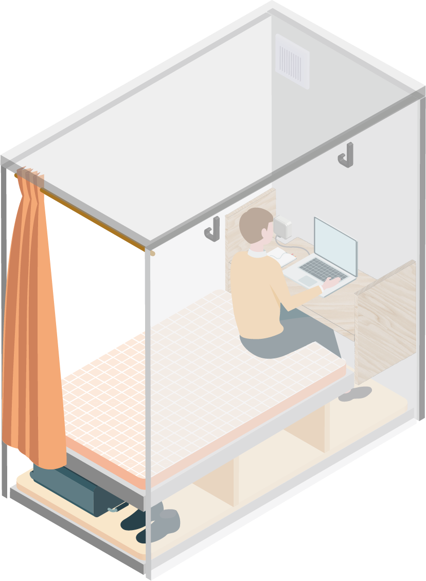 SQUARE SPOTは、ベッドとしての機能だけでなく、寝る前に背もたれに寄りかかって読書をしたり、テーブルを展開してノートパソコンで調べ物をしたりと、プライベートが確保された個室のような空間で、充実した自分時間を過ごすことができるオールインワンのカプセルベッドです。