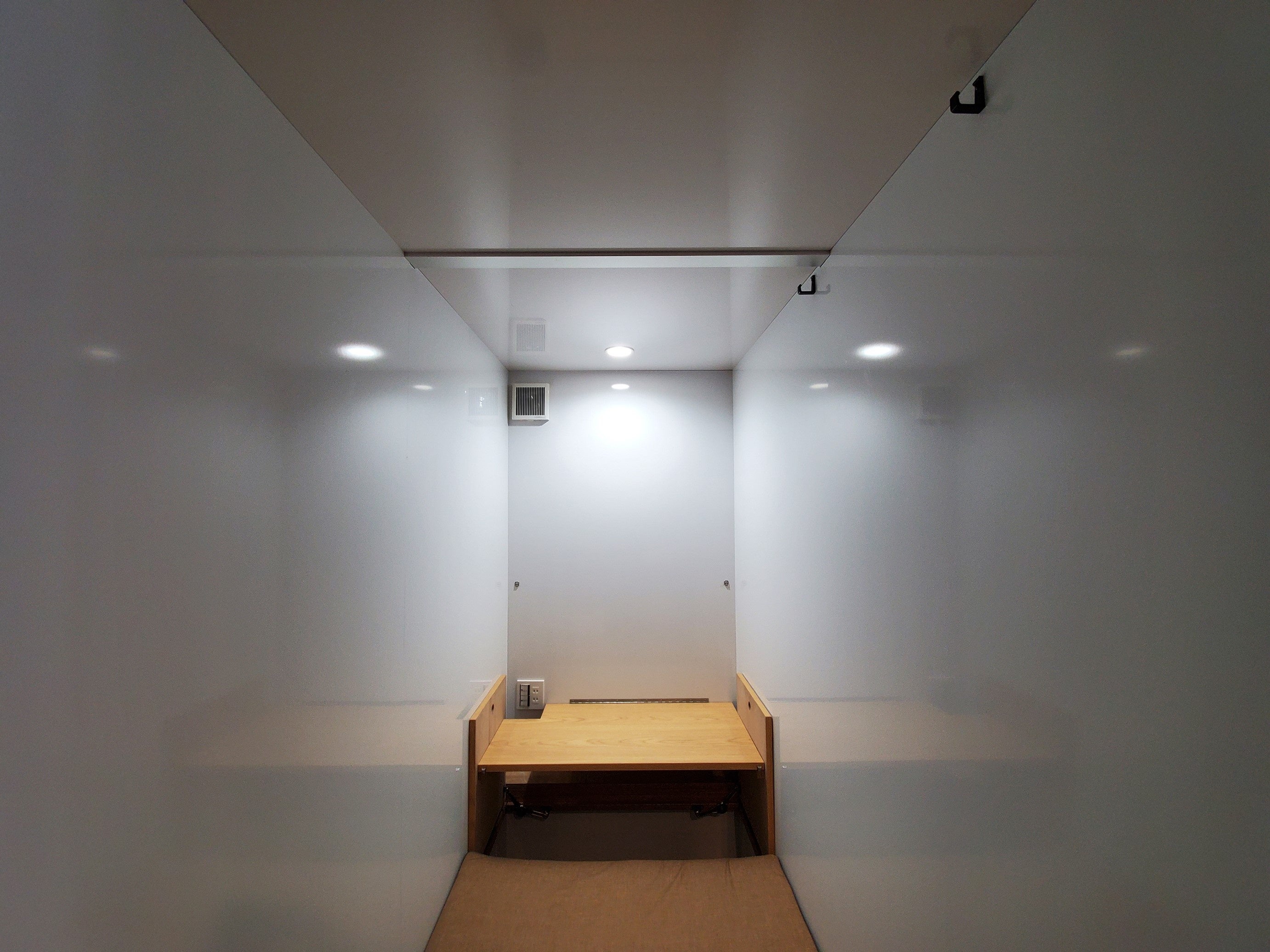 天井高が高く、圧迫感がありません。寝具は高反発マットレスを採用。腰の負担を和らげます。照明と換気ファンは枕元のスイッチで操作します。枕元にはメガネやペットボトルなどを置く小物置きもあります。