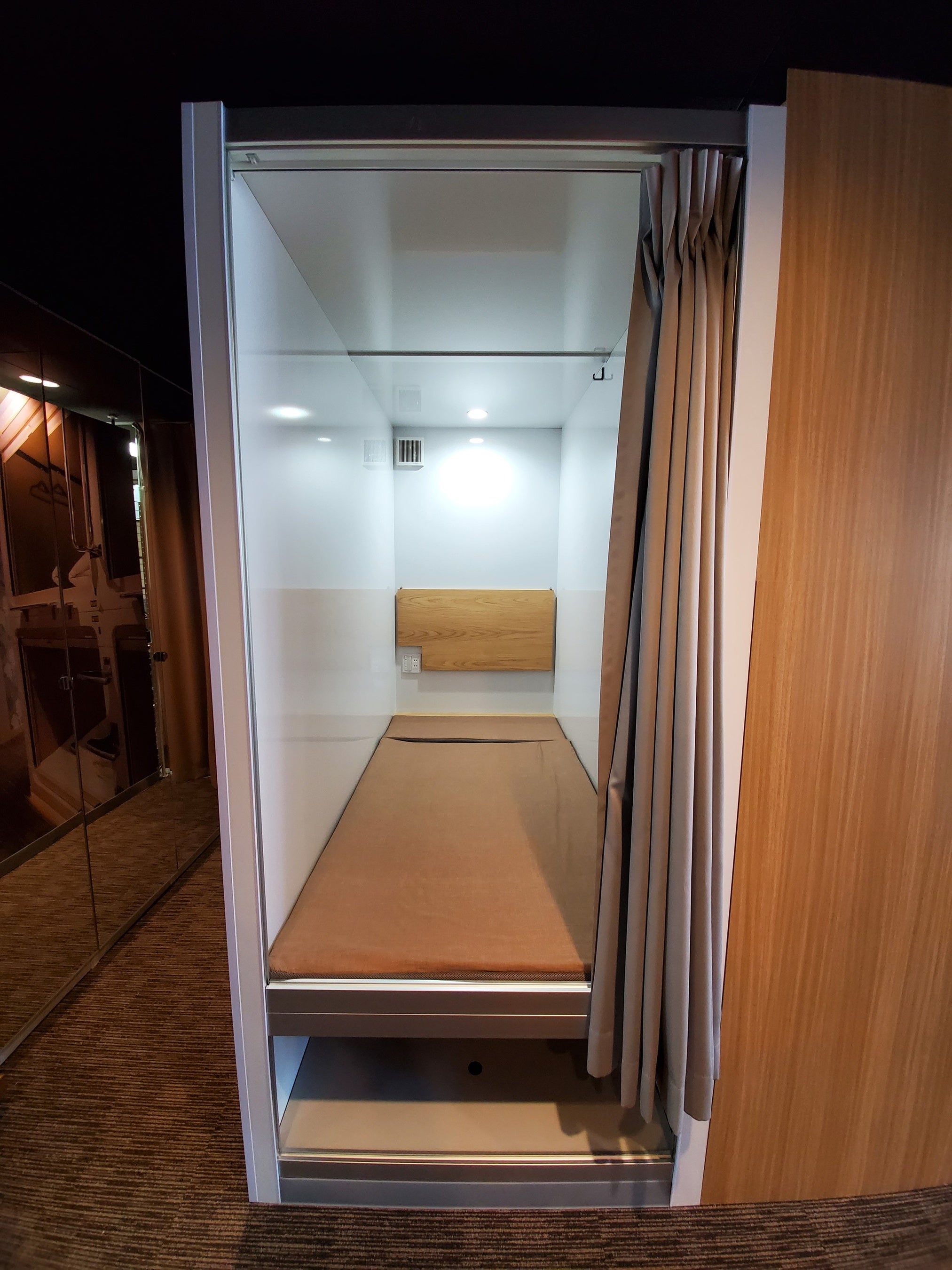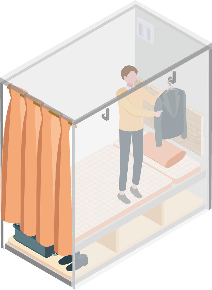 睡眠スペースは170cmの人でも立てるくらい広々としています。入口部のカーテンを閉めることで、更衣室のように仕事着から寝巻きや館内着に着替えることができます。脱衣した服はハンガーに掛け、付属のフックに掛けられます。