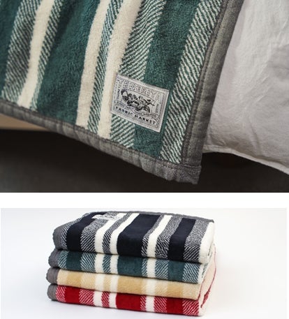 「シール織り」という和歌山県高野口の職人にしか作れない特殊な技法をつかった、やわらかなカラーとさりげないボーダーのデザインでお部屋にもなじむブランケット。ご自宅でお洗濯ができること、静電気が起きにくいことも特徴です。