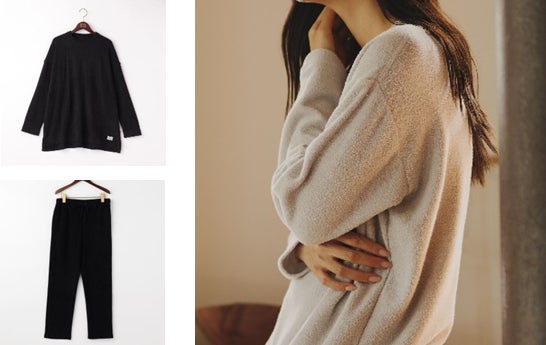 タオルのような心地よさとニットの伸び縮みによる着心地の良さを合わせた、周りの人までも思わず頬ずりしたくなるパイルジャージ素材。極上の柔らかさとしなやかな伸縮性がくつろぎの時間に最適なルームウェアです。毎年展開している定番商品ですが、今期はワンピースの着丈を98cmと短めに設定したことで、レギンスやパンツとのコーディネートがしやすくなりました。