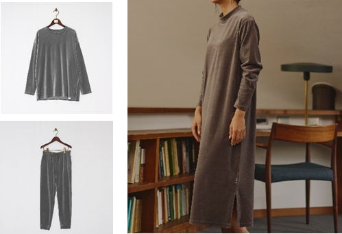 コットンでつくるベロア生地は、やわらかさと温かさはもちろん、蒸れにくいこと、静電気が起きにくいことからルームウェアにぴったりの素材です。パンツの裾にゴムを入れることでずり上がりにくく、くつろぎの時間にぴったりのデザイン。今期デザインをブラッシュアップしたワンピースは、モックネックと長めの着丈で一枚でも温かく着られます。