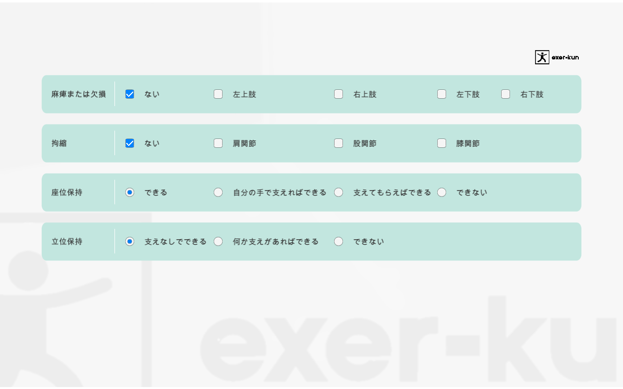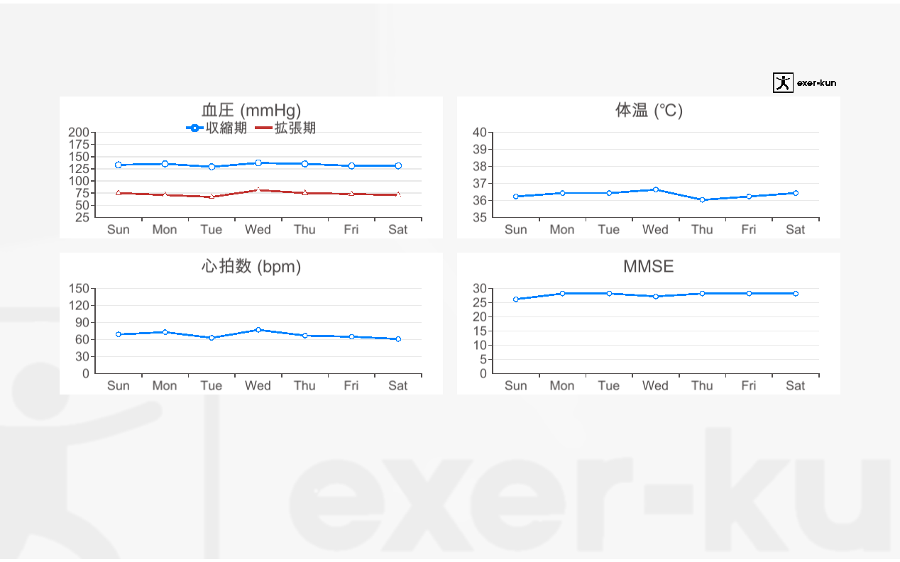 アプリケーション内に血圧、体温、心拍数、MMSE値(認知症スクリーニング検査スコア)を記録することができます。exer-kunを各種バイタルサイン値の記録機器として使用することも可能です。
