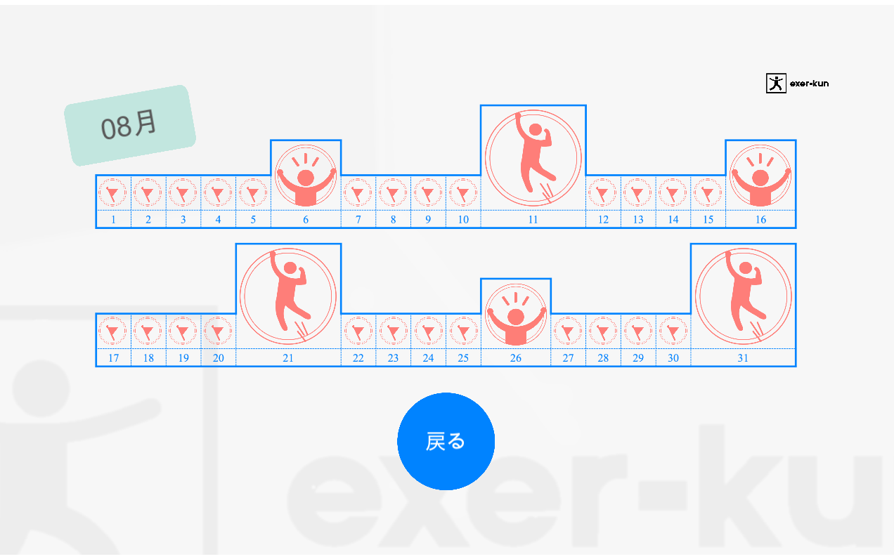 exer-kunでは、独自スコア「エクサポイント」を開発し、毎日の運動量を評価し可視化する機能を組み込んでいます。また、ラジオ体操のスタンプのように、運動を行うとアプリケーション上でスタンプが入手できる機能も備えています。日々の運動量を可視化することで、運動継続のモチベーション維持や職員とのコミュニケーション促進につなげることができます。