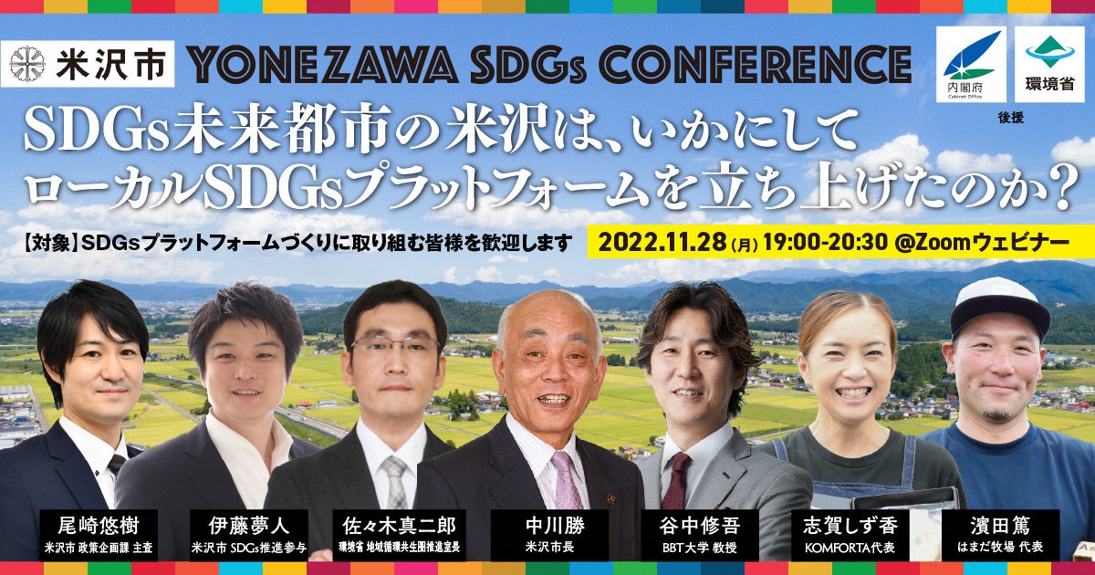 内閣府「SDGs未来都市」と環境省「地域循環共生圏づくりプラットフォーム」に選定された自治体としてSDGsを推進する山形県米沢市(市長:中川勝)は、2022年11月28日(月)夜、内閣府と環境省の後援による「米沢SDGsカンファレンス」をオンライン開催します。ローカルSDGsのプラットフォームづくりをテーマとして、その実践ノウハウを公開するカンファレンスです。ゲスト登壇者には、BBT大学 教授の谷中修吾氏、環境省 地域循環共生圏推進室長の佐々木真二郎氏を迎え、米沢市内の実践的な取組からKOMFORTA 代表の志賀しず香氏、はまだ牧場 代表の濱田篤氏を招聘するとともに、本市よりSDGs推進参与の伊藤夢人、政策企画課の尾崎悠樹が登壇します。全国各地でSDGsプラットフォームづくりに取り組む皆様のオンライン参加を歓迎し、東北のSDGs未来都市である米沢市が経験したプラットフォームづくりの知見を共有します。