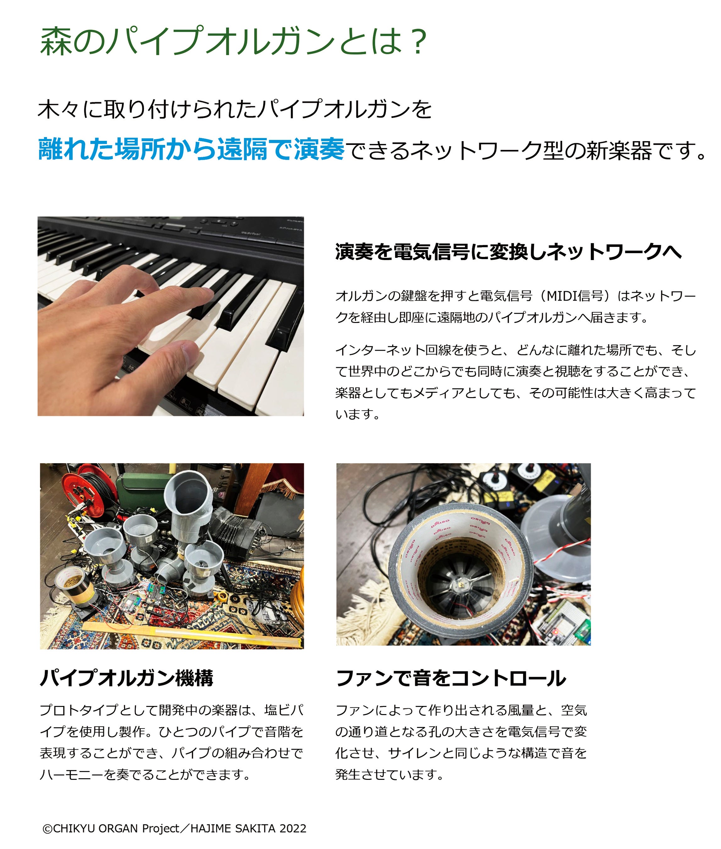 奥河内の豊かな自然と人々の温かさに惚れこんで自身も8年前に大阪の河内長野市に移住した、のこぎり演奏家・サキタハヂメによる、山や森の木々が立ち並ぶままにパイプオルガンのように鳴り出したら面白いのではないかという奇想天外な妄想から始まった『地球オルガンプロジェクト』。