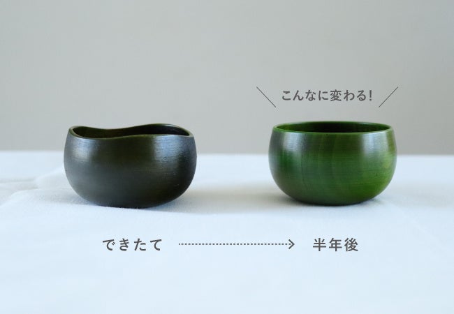 少しずつ飴色の生漆が透明に近づき、だんだんと鮮やかな色に変わっていく経年変化を楽しんでいただけます。