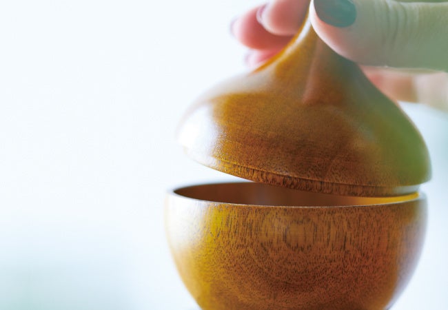 ろくろ挽き=木目模様を生かした自然な風合いが魅力の山中塗。本商品では、植物のようなフォルムに近づけるため、回転ろくろや旋盤のほか、最後は手彫りで木地を整え、花のような曲線や球根の芽吹きを表現しました。
