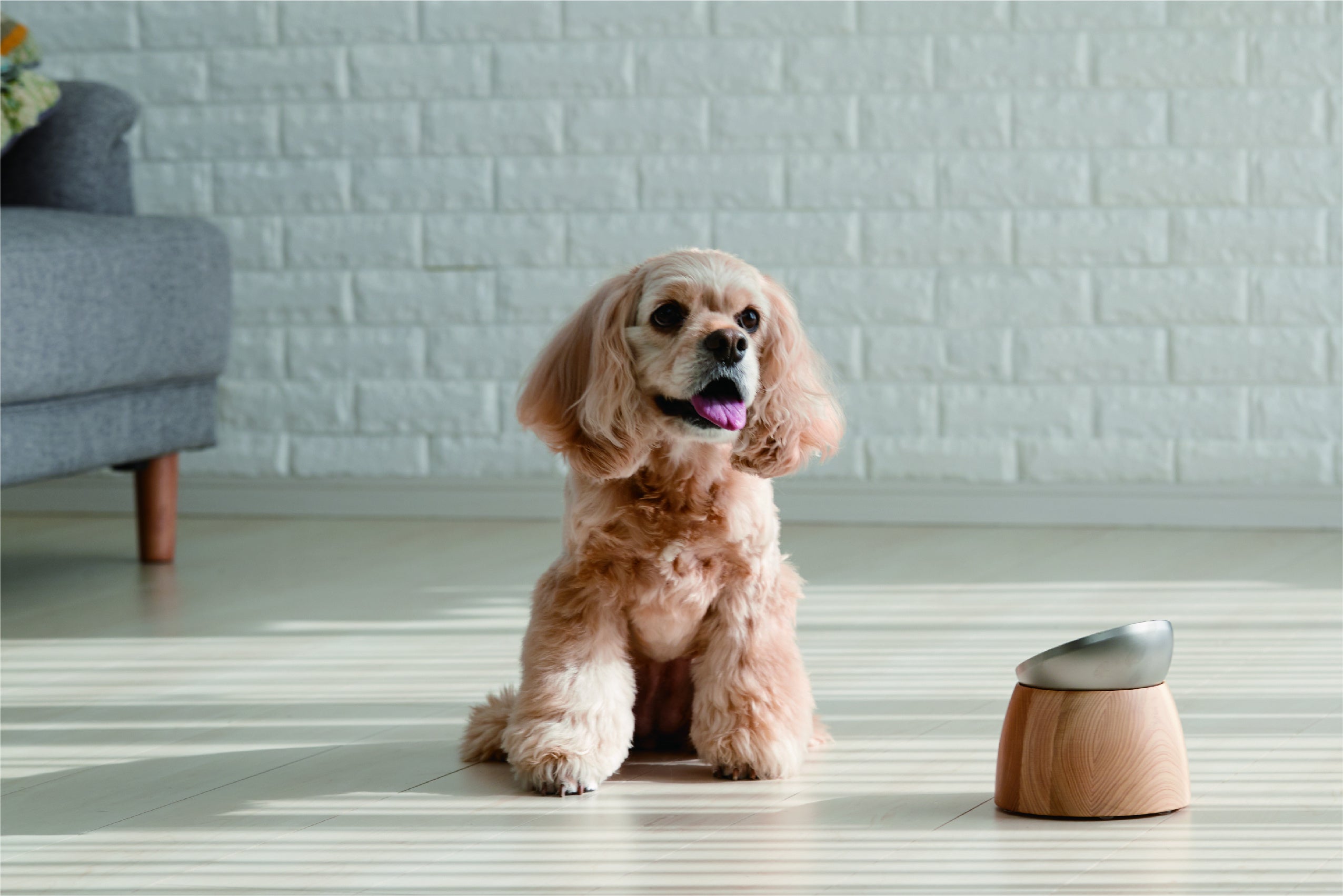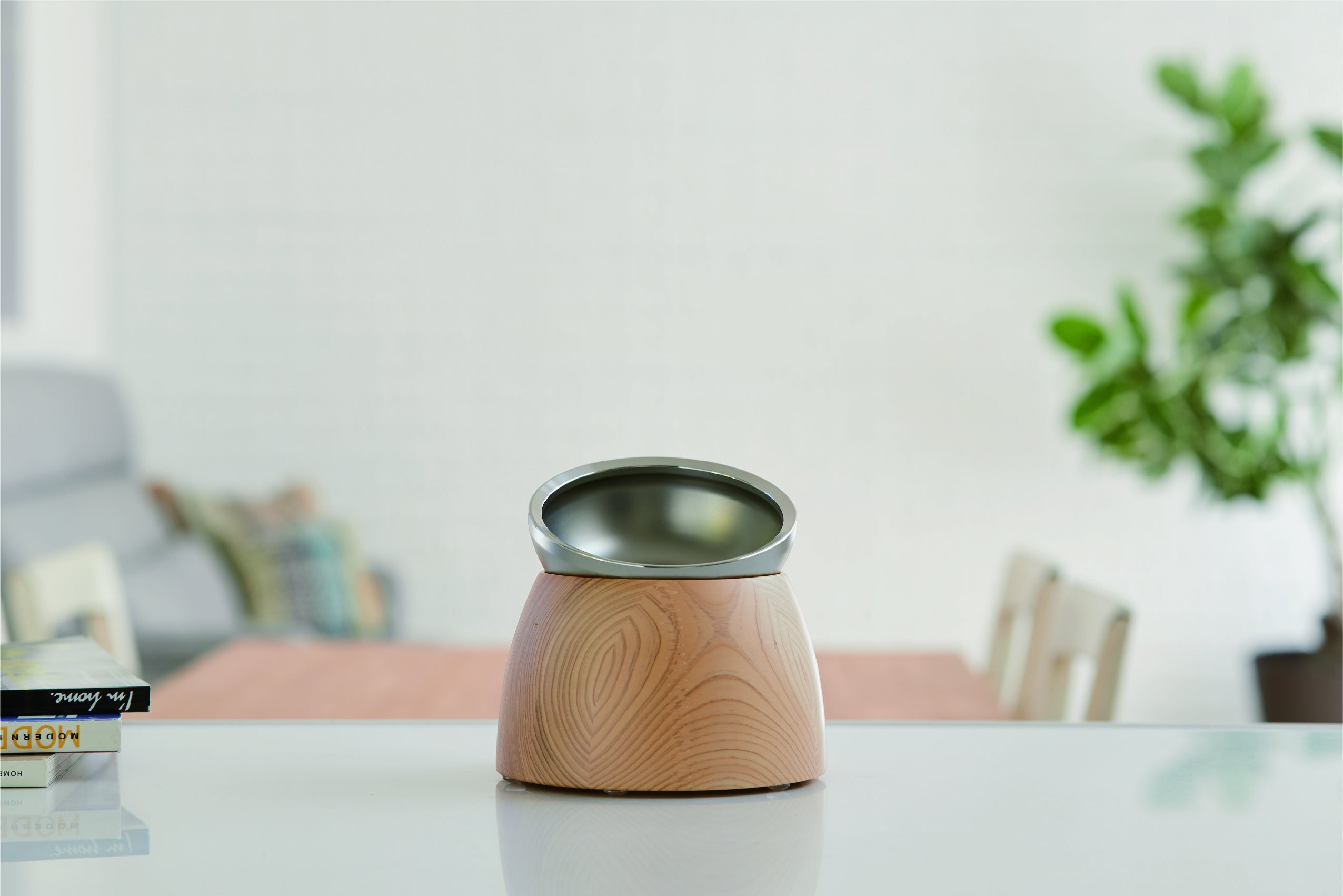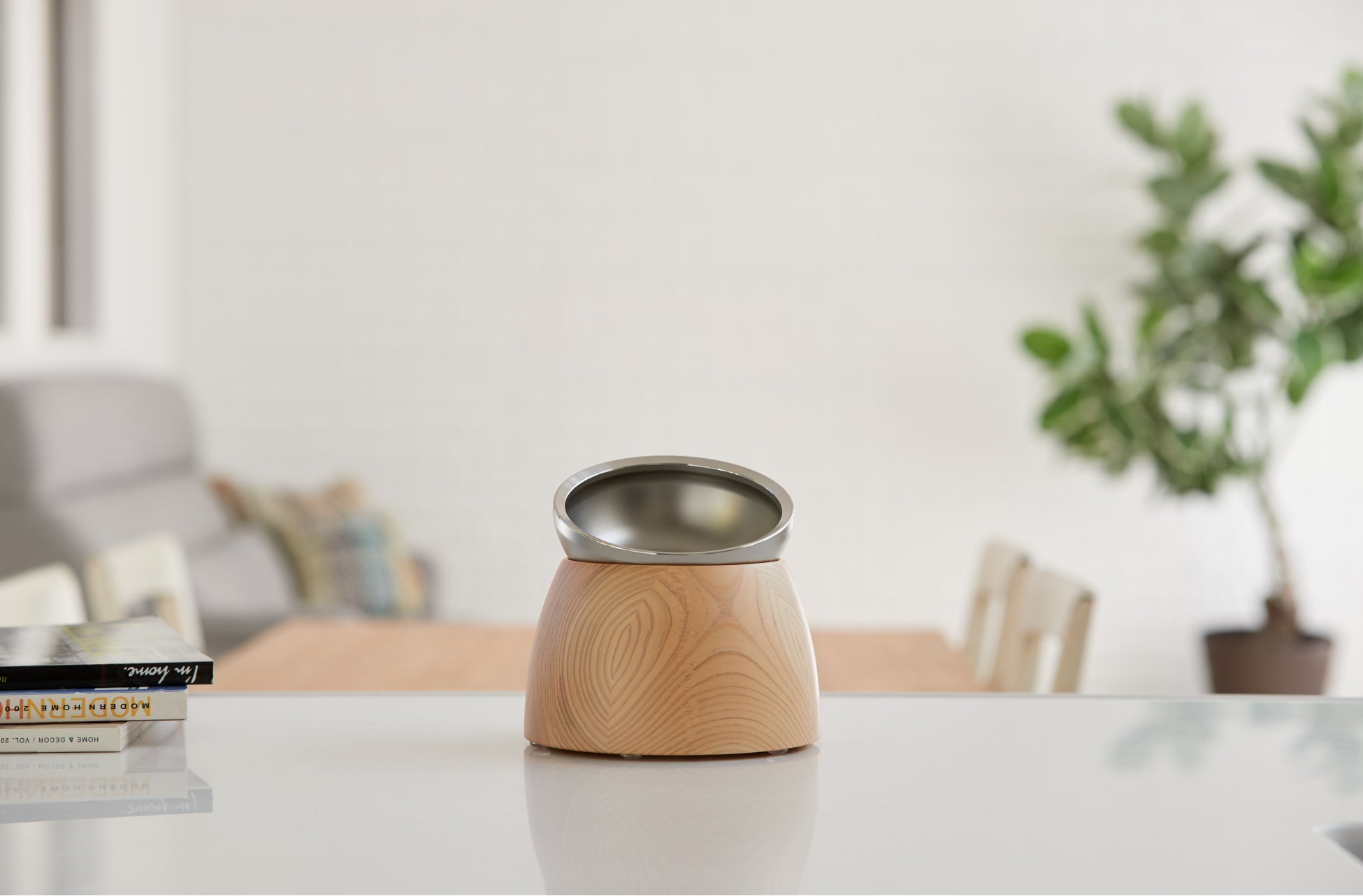 喉の詰まりや吐き戻しを防ぐ為、自然な姿勢で食べやすい高さを独自に研究しました。ボウルは角度を自由に変えられ、デザインにもなっているボウルのフチには返しがあるため、食べやすさとこぼれにくさを両立しています。この形状を実現させるため、高級腕時計や航空機の部品加工に用いられる「削り出し」という工法を採用しました。軽すぎず重すぎないボウルは安定感があり動かないので快適な食事ができます。スタンドには香り高くきめ細やかな美しい木目が特徴の「東濃ヒノキ」を採用し、飼い主のこだわりのお部屋、お洒落なインテリアに相応うスタイルになっています。又、肉厚で重厚感のあるボウルは、フードを注ぐ時、食事をしている時、ドライフードがフードボウルに当たることによって高級感ある音色が奏でられ、食というペットにとって至福な時を「音」を通じて飼い主にも感じていただき、共に心豊かな時を過ごせることを実現しています。
