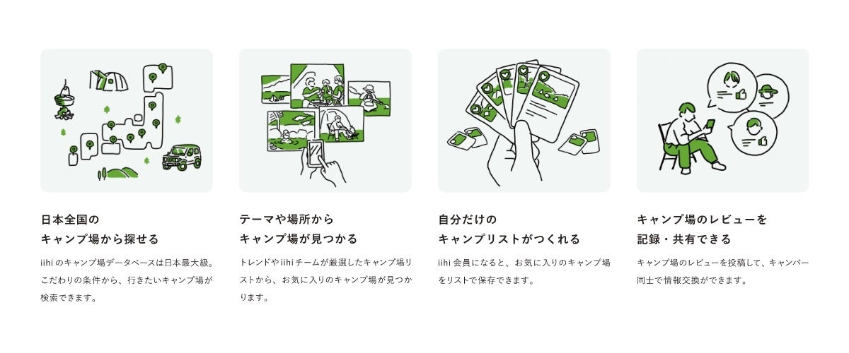 iihiの主な特徴は、「初心者からベテランまで満足できる、こだわりの条件からの検索」「テーマ・トレンドリストによる未知のキャンプ場との出会い」「仲間とシェアできるオリジナルリスト作成」「キャンプ場オーナーへ感謝も伝えられる、キャンプ場へのレビュー機能」といった4つの機能です。
