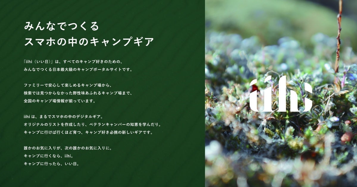 iihiは、すべてのキャンプ好きのための、みんなでつくるキャンプポータルサイトです。現在日本のキャンプ場数は4,000を超えるものの、Webサイトや予約機能をもたないキャンプ場は依然として多く、また旅行と異なり行き先のエリアが毎回近接していることから、キャンパー(キャンプ好きな人)にとってキャンプ場検索は「検索してもいつも似たところが出てくる」「新しいキャンプ場になかなか出会えない」という課題がありました。