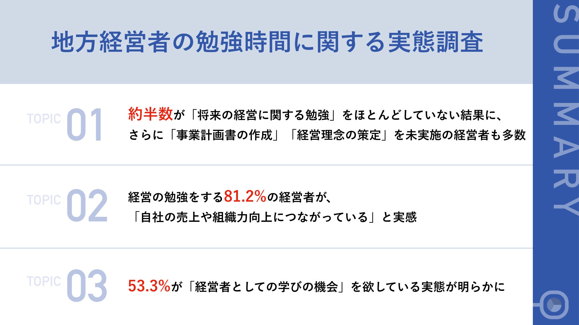 一方で、将来の経営のために学ぶ地方経営者は、主に「事業運営スキル」や「専門知識」「業界知識」を勉強しており、将来の経営のために学ぶ経営者の81.2%が「自社の売上や組織力向上につながっている」と実感していることが分かりました。