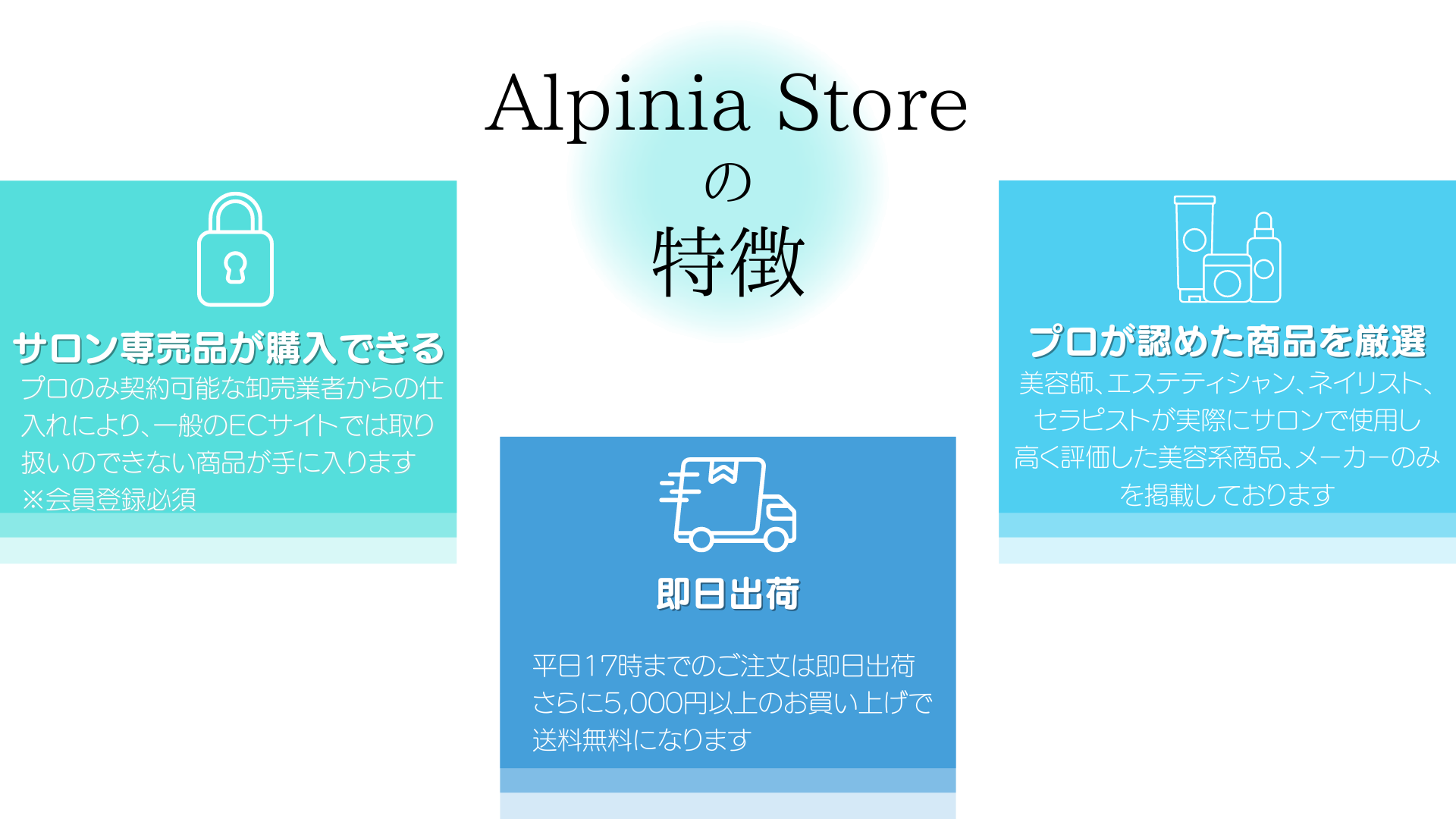 Alpinia Store(アルピニアストア)では、エステティックサロンや美容室、ネイルサロンなどで専売されている化粧品・美容商品を取り扱っております。