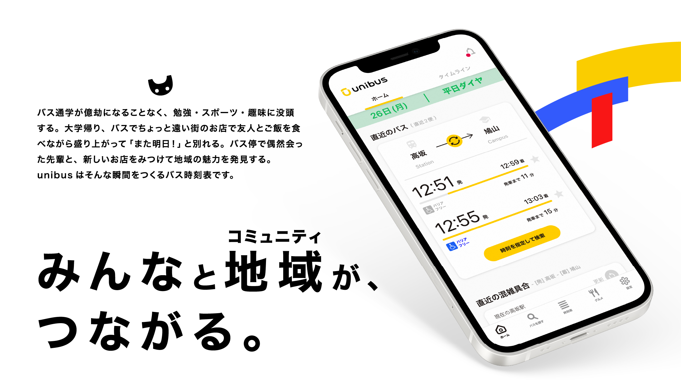 unibus は、大学のキャンパスに通う学生と地域コミュニティ(お店、商店街など)を、バスという "徒歩より広く、電車より狭い移動手段” でつなぐことで、ここでしか得られないユニークなキャンパスライフと地域とのコミュニケーションを提供します。