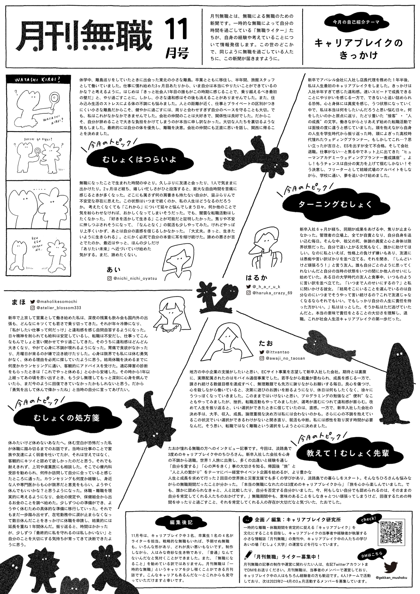 「キャリアブレイク」に関する情報誌を毎月6日に発行いたします。キャリアブレイクにいたった経緯、キャリアブレイク中にやってよかったこと、焦る気持ちとの向き合い方、などをキャリアブレイク当事者が執筆し記事にします。誌面を通じて、日本のどこかでキャリアブレイクをしている仲間とつながれる情報誌となっています。