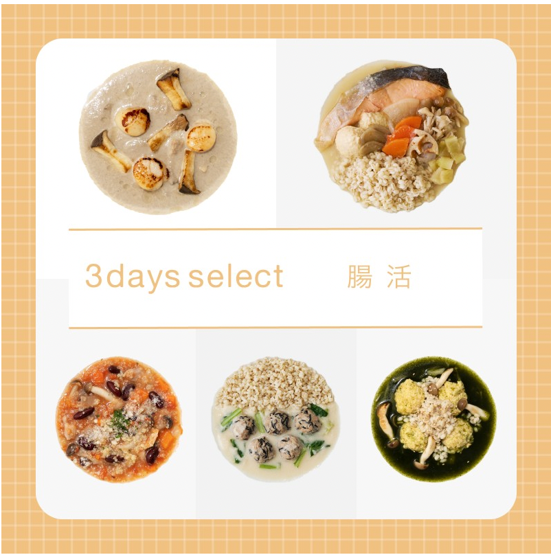 腸活をテーマに写真の5種類のメニューからお好きなものを3つ選んでオーダーすることが可能です。