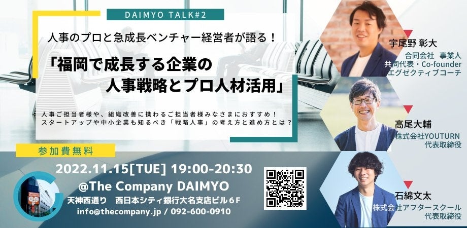 さらには、福岡を中心にハイキャリアUIターン人材と企業のマッチングサービスを提供する株式会社YOUTURN代表取締役高尾大輔氏・Fukuoka Growth Nextで急成長中の注目ベンチャー、株式会社アフタースクールCEO石綿文太氏にもご登壇いただき、採用の悩みから人材の定着・成長まで幅広い人事のトピックをパネルディスカッション形式で語っていただきます。