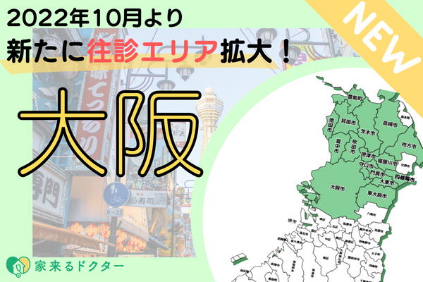 夜間・休日の医療相談・往診サービス「家来るドクター」(https://iekuru-dr.com/)を運営する家来るドクターJAPAN株式会社(本社:愛知県北名古屋市、代表取締役社長:高城 浩致)は、2022年10月3日より、名古屋エリアにつづき、新たに大阪エリアでもサービス提供を開始いたします。