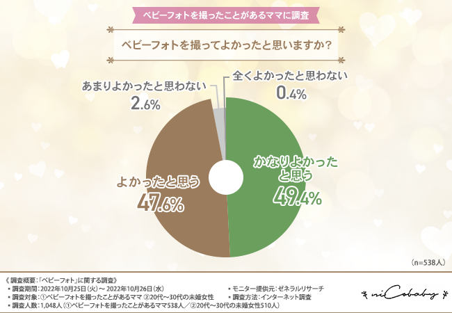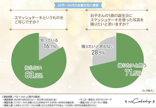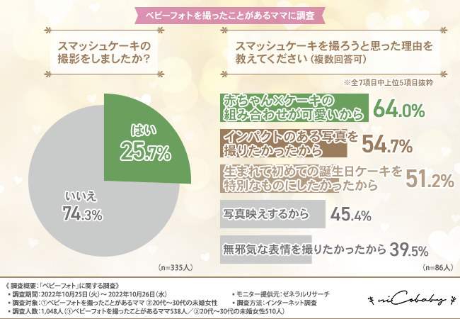 そこで今回、合同会社niCobaby (https://nicobaby.shopinfo.jp/)は、①ベビーフォトを撮ったことがあるママ、②20代~30代の未婚女性を対象に、「ベビーフォト」に関する調査 を実施しました。