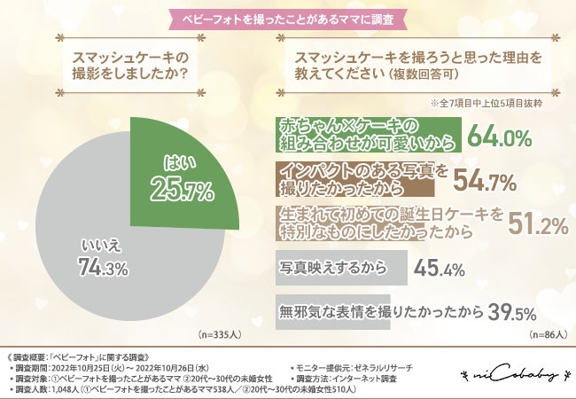 続いて、「1歳バースデー」のタイミングでベビーフォトを撮った方を対象に、「スマッシュケーキの撮影をしましたか?」と質問したところ、約4人に1人が『はい(25.7%)』 と回答しました。
