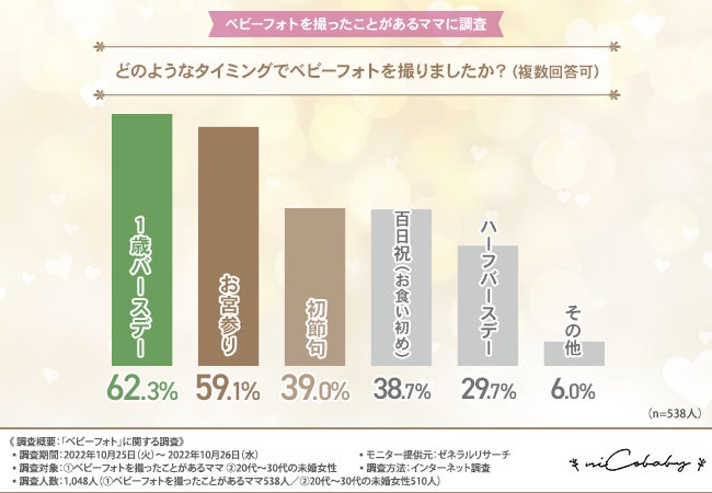 まず、「どのようなタイミングでベビーフォトを撮りましたか?(複数回答可)」と質問したところ、『1歳バースデー(62.3%)』 と回答した方が最も多く、次いで『お宮参り(59.1%)』『初節句(39.0%)』『百日祝(お食い初め)(38.7%)』『ハーフバースデー(29.7%)』 と続きました。