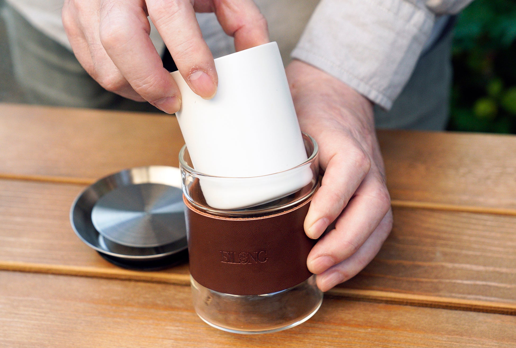 持ち手がなくスマートな形状のポータブルポットは、高い耐熱性を持つホウケイ酸ガラス製で、茶葉が広がっていく様子など目でもお茶が楽しめます。取り外しできるレザー調カップスリーブ付きで、お茶を注ぐ際に手が熱くなりません。フタは錆びにくく高価な「SUS316」というステンレス鋼製。きめの細かなフィルターと一体化したシンプルな設計で、茶葉をきれいに取り除きます。注ぎ口は360度どの角度からも注ぐことができ(※)、かつ液だれしにくいストレスフリーなデザインとなっています。