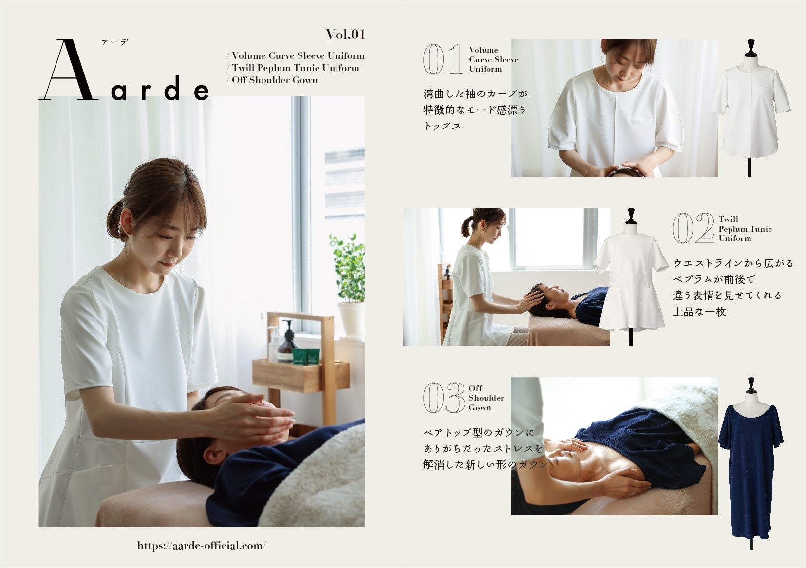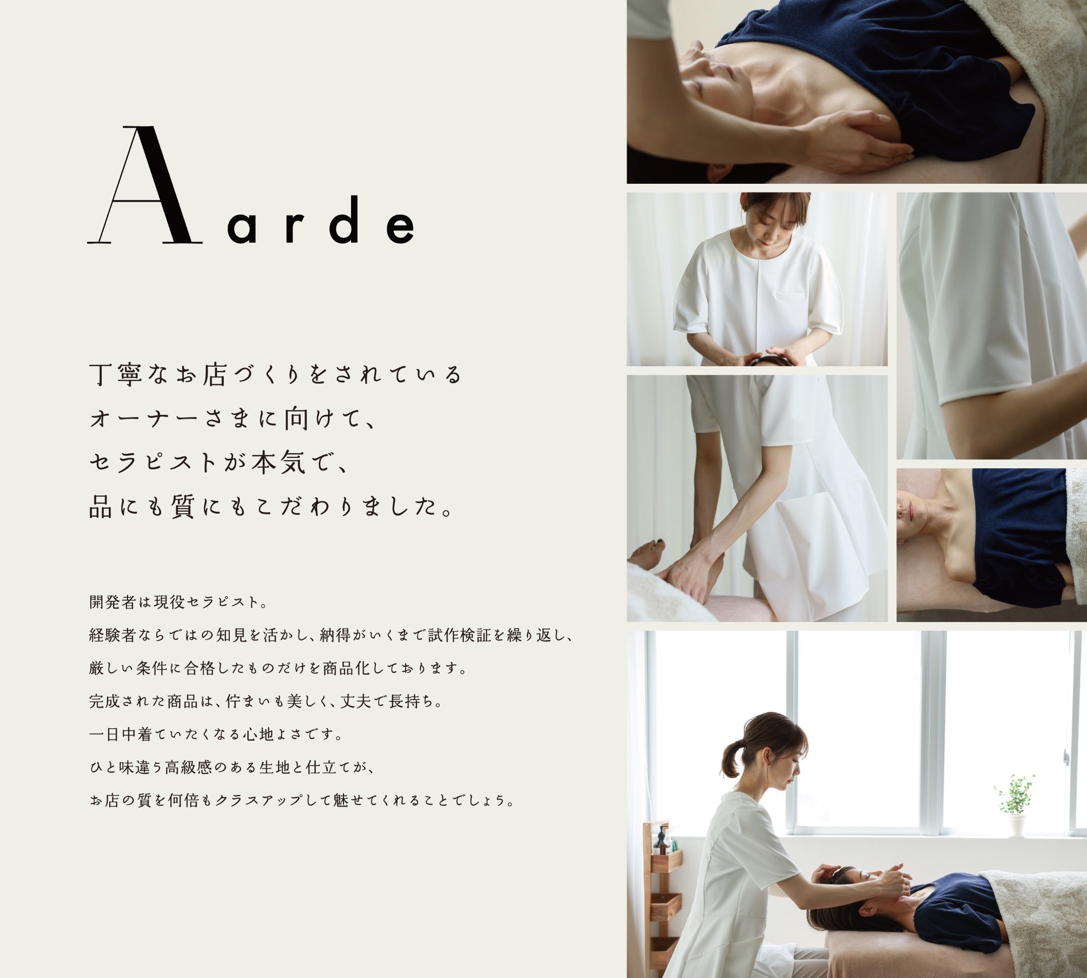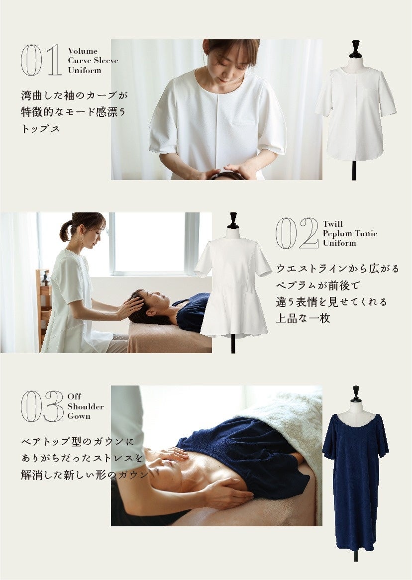 お客様にリラックスしていただく工夫や、オーナー様の気持ちを昂らせるモノづくりは、開発者が現役セラピストだからこそ。今年発表したばかりのユニフォームも他にない高品質かつ高機能商品で大注目です。