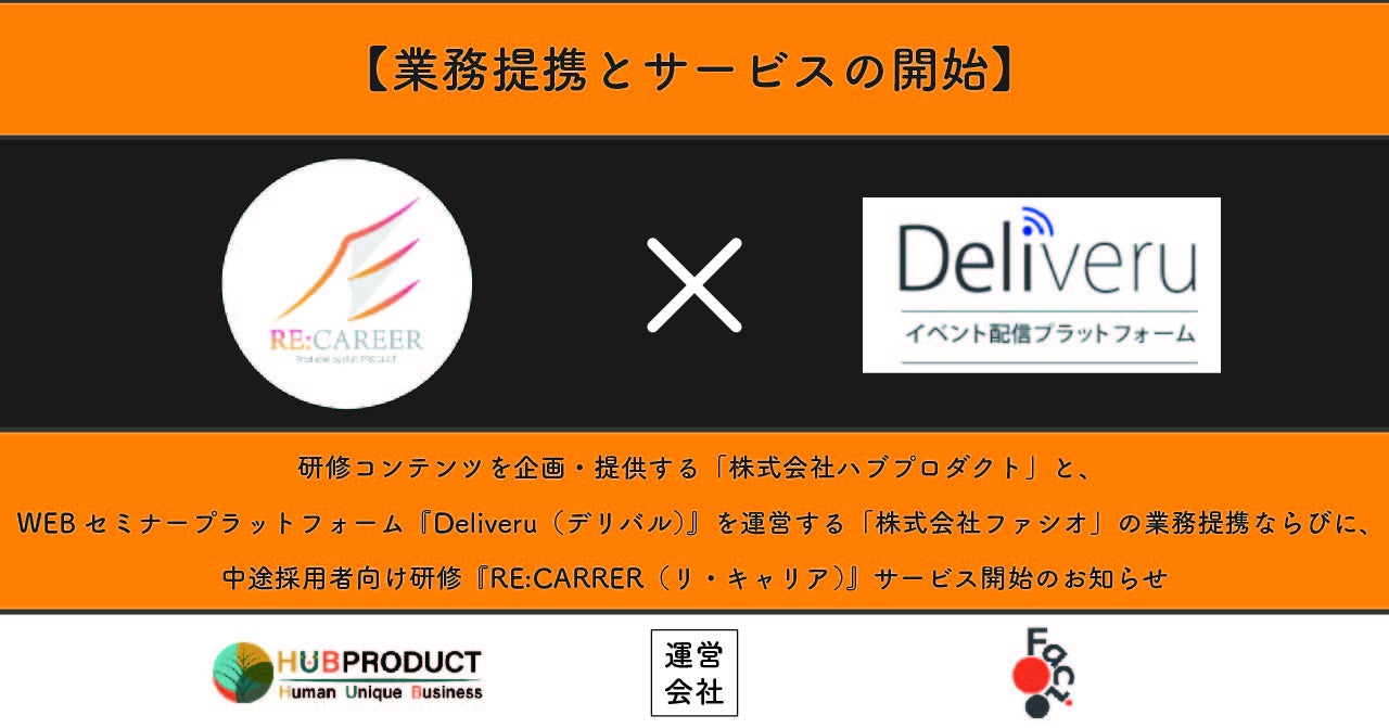 企業研修を企画提供する㈱ハブプロダクトと、WEBセミナープラットフォーム『Deliveruデリバル』を運営する㈱ファシオの業務提携&中途採用者向け研修『RE:CARRER リ・キャリア』開始のお知らせ