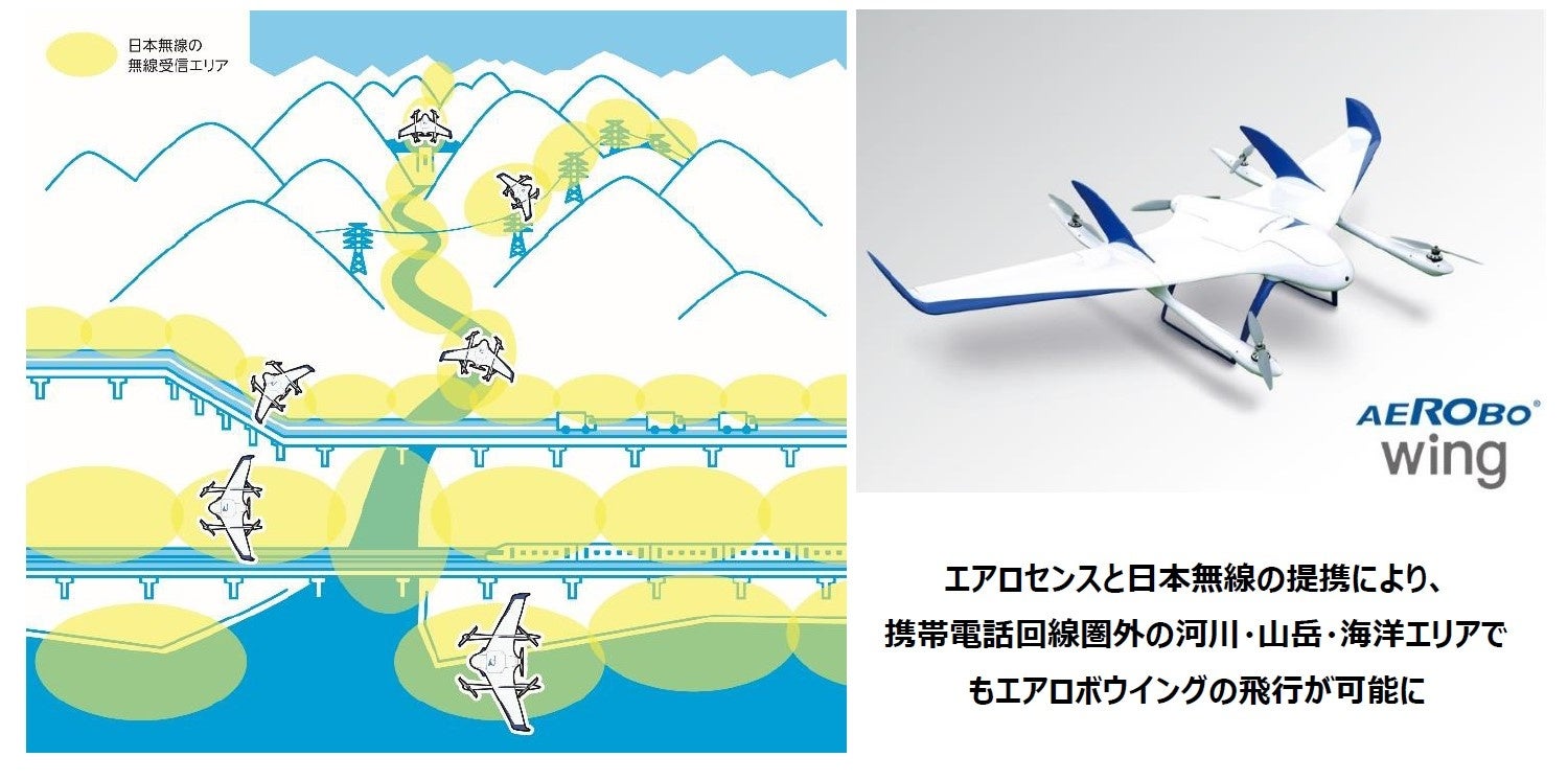 両社の協働により、携帯電話回線圏外エリアでのVTOL型ドローン「エアロボウイング」による飛行・点検を目指します