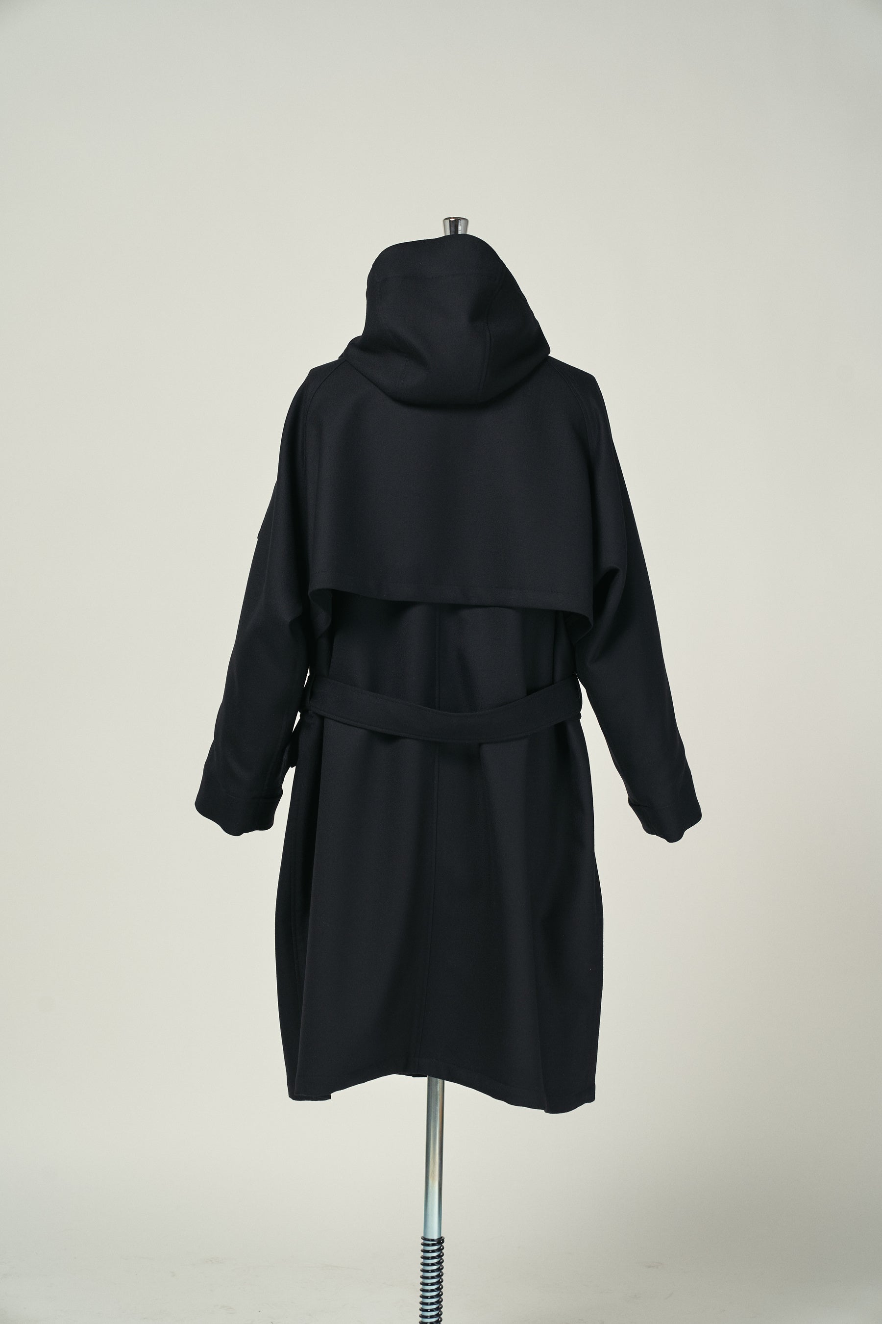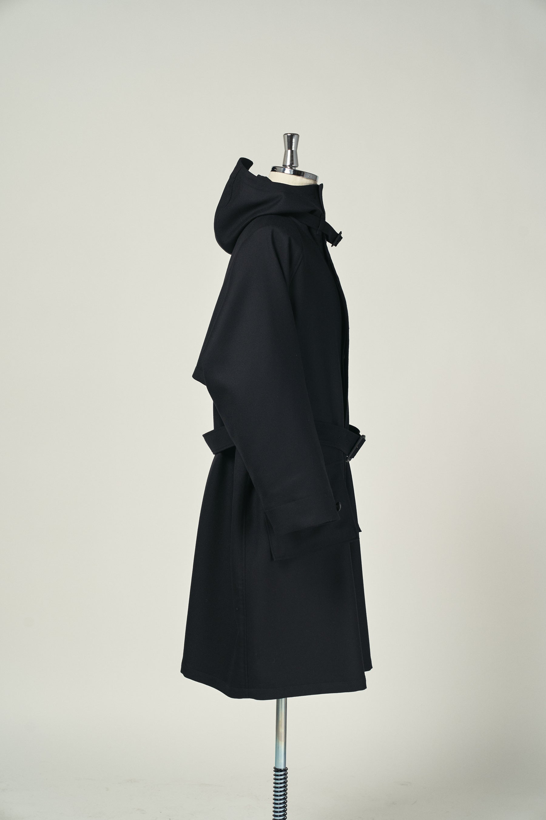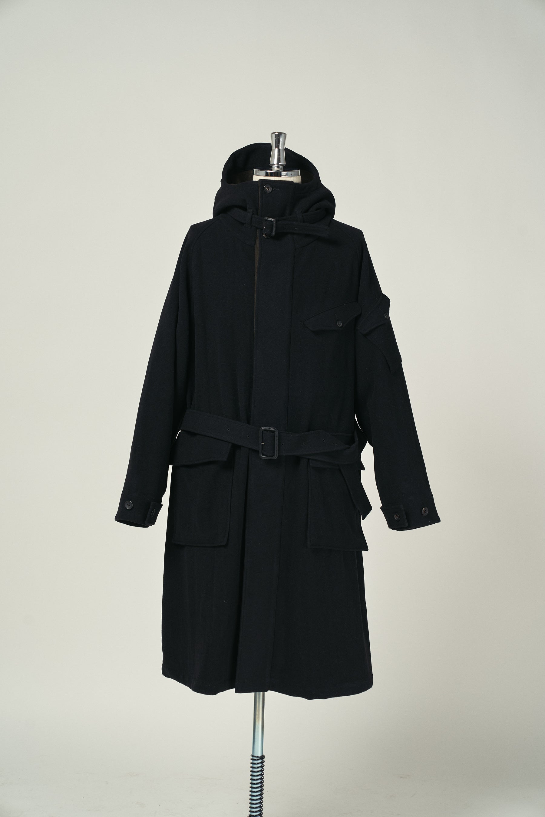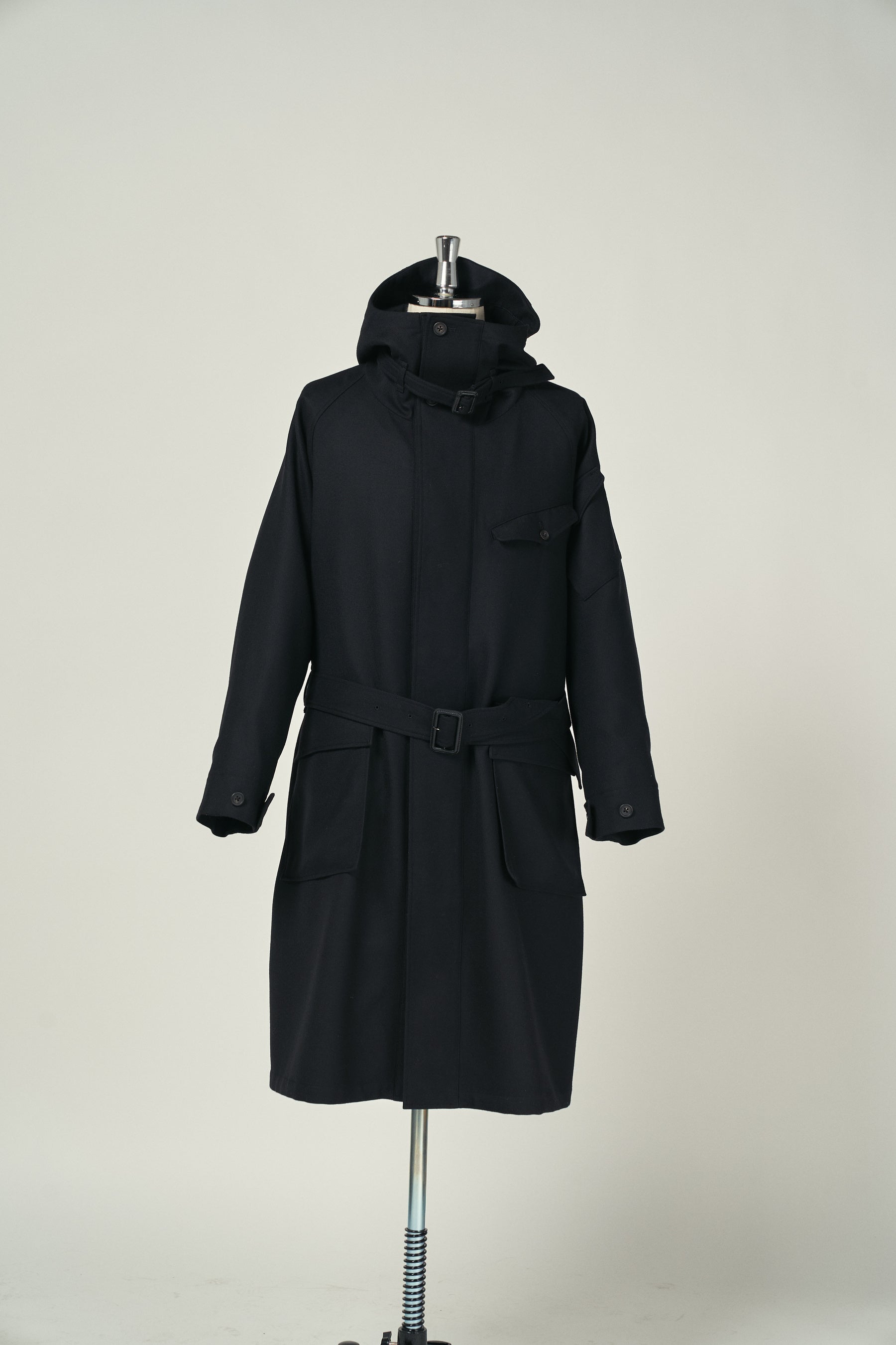たっぷりとした分量感を持つ裏付きのウールコート。フード裏や前立て裏などには薄手のウールギャバジンを使用することでスッキリとした仕上げに。最適な位置に配置した袖のポケットと胸ポケットにスマートフォンやカードケースを、大きめな腰ポケットにはロングウォレットも収納可能。フードとウエストの共ベルトでシルエットをアレンジ。釦は本水牛、共ベルトはレザーのクルミバックル。