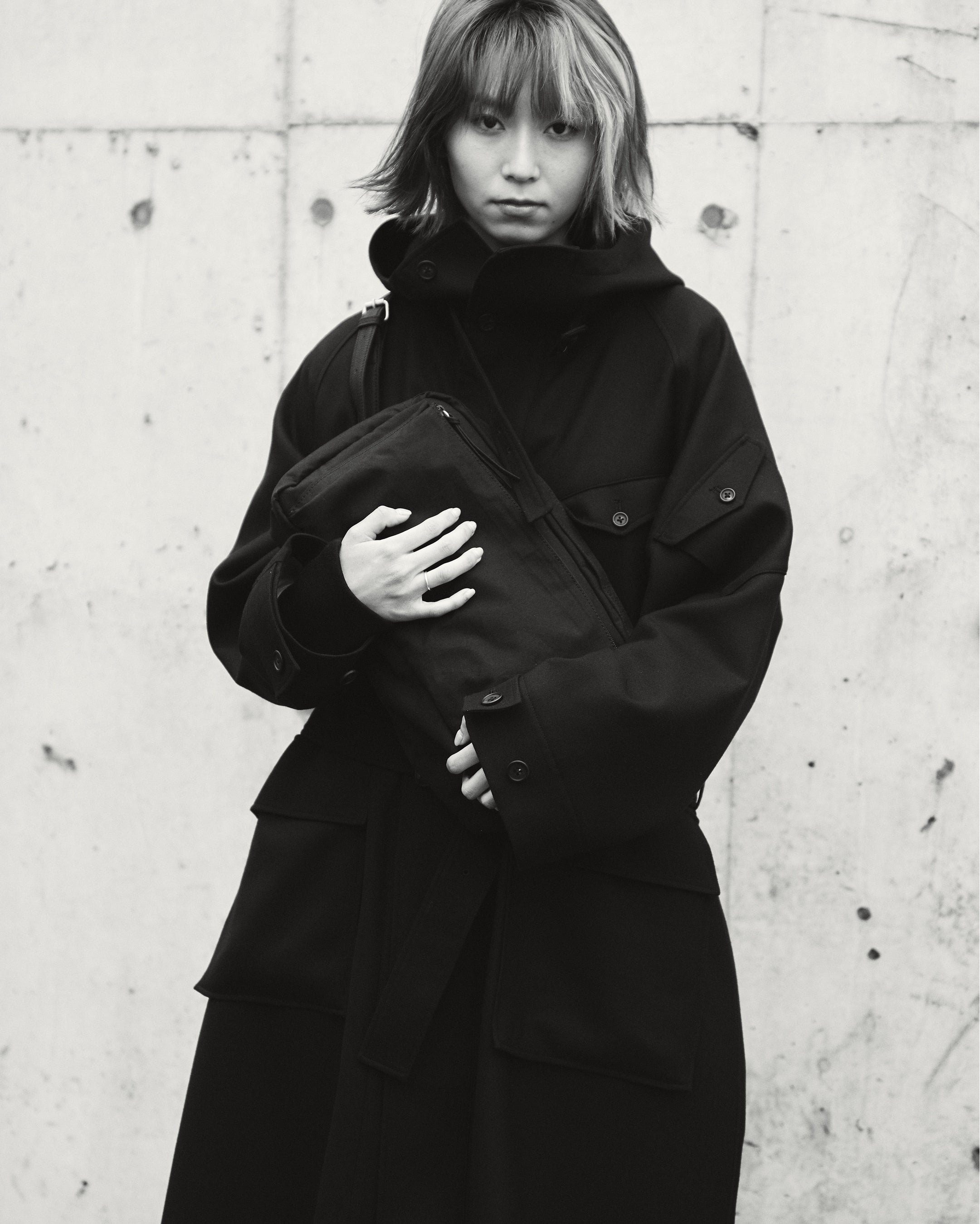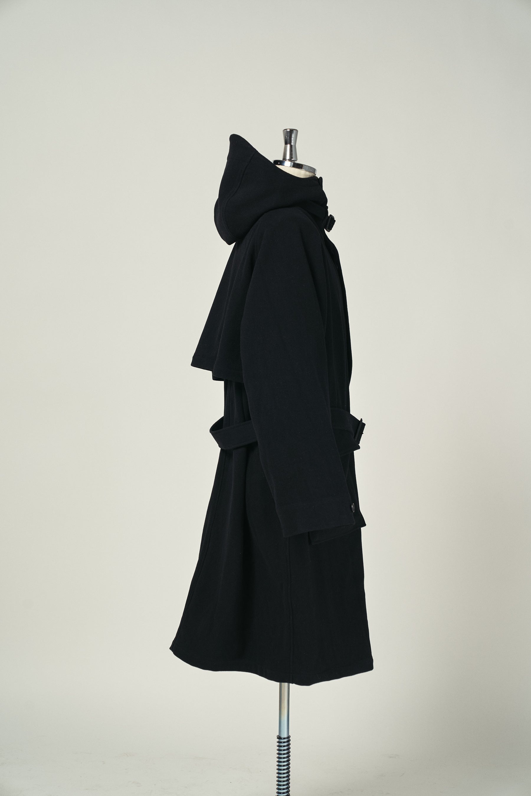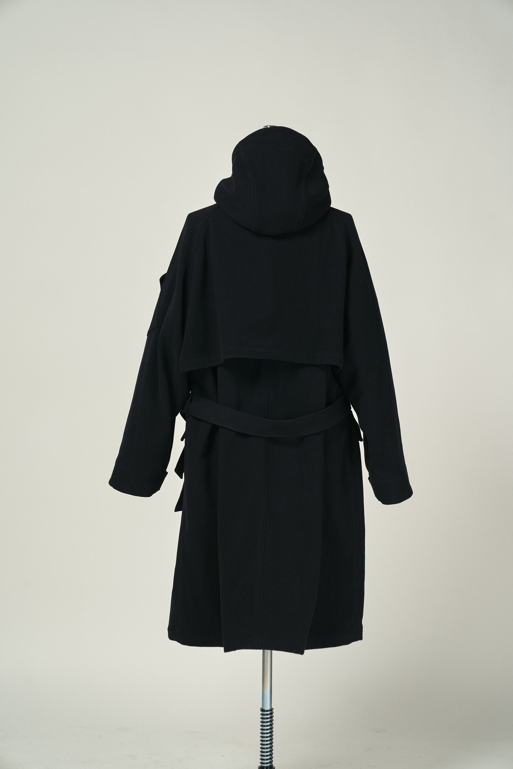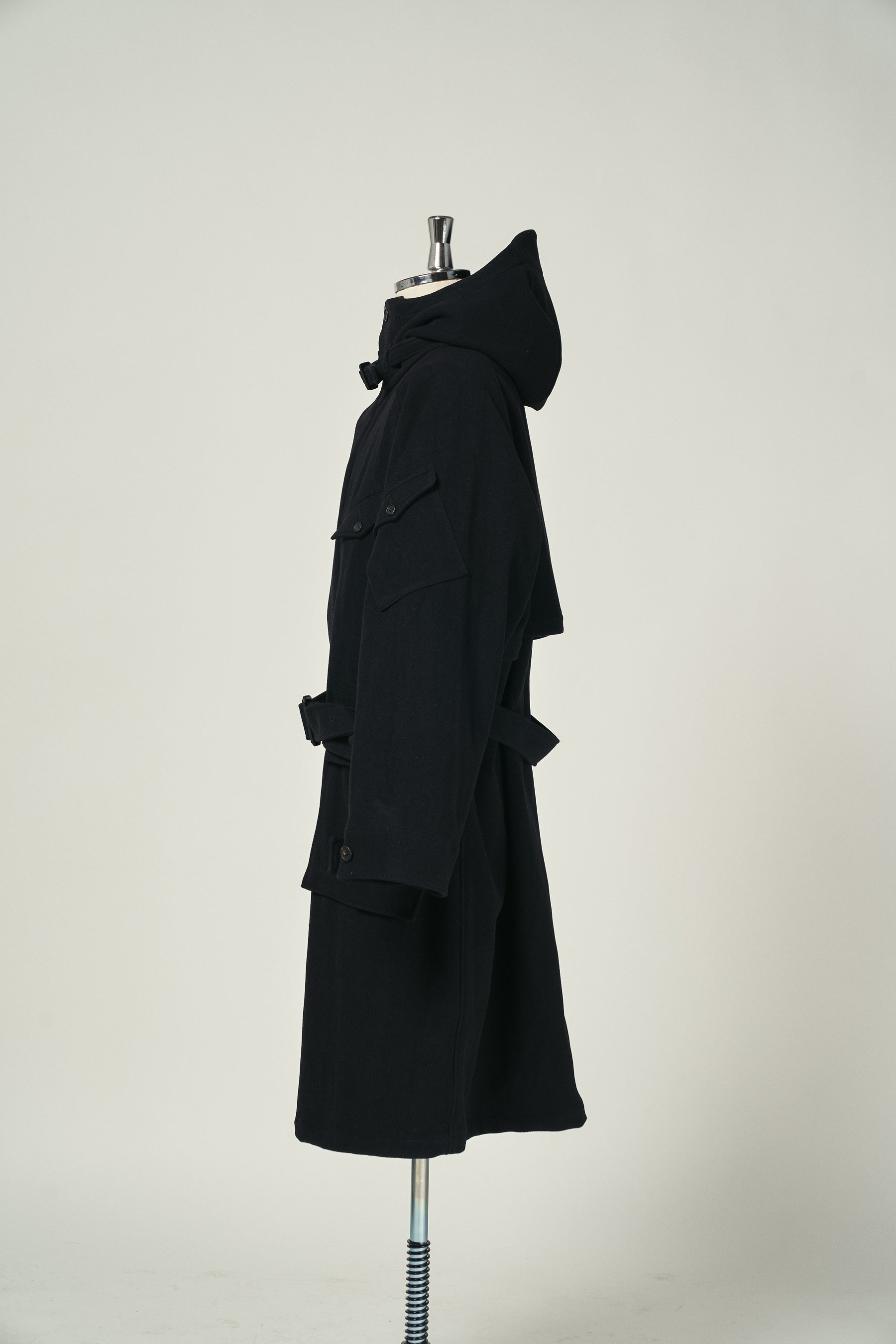 たっぷりとした分量感を持つ裏付きのウールコート。フード裏や前立て裏などには薄手のウールギャバジンを使用することでスッキリとした仕上げに。最適な位置に配置した袖のポケットと胸ポケットにスマートフォンやカードケースを、大きめな腰ポケットにはロングウォレットも収納可能。フードとウエストの共ベルトでシルエットをアレンジ。釦は本水牛、共ベルトはレザーのクルミバックル。