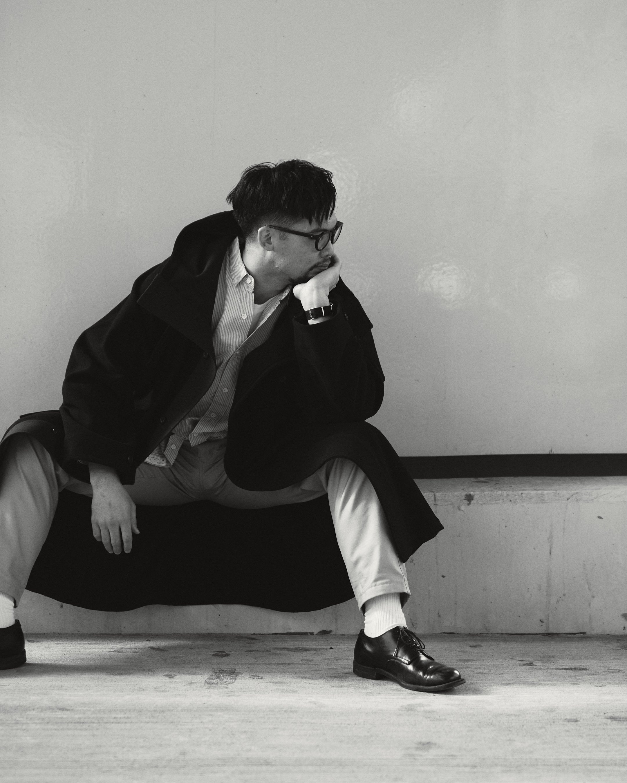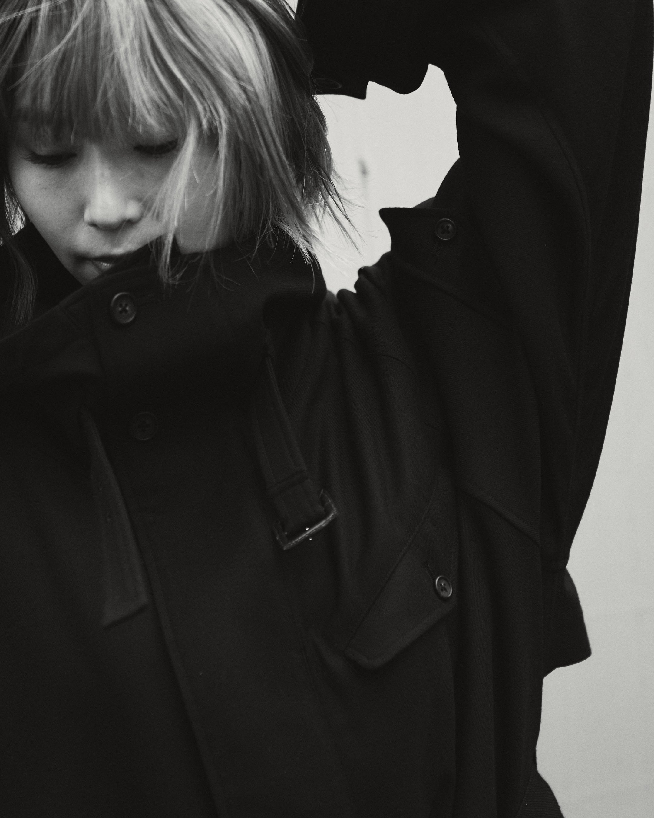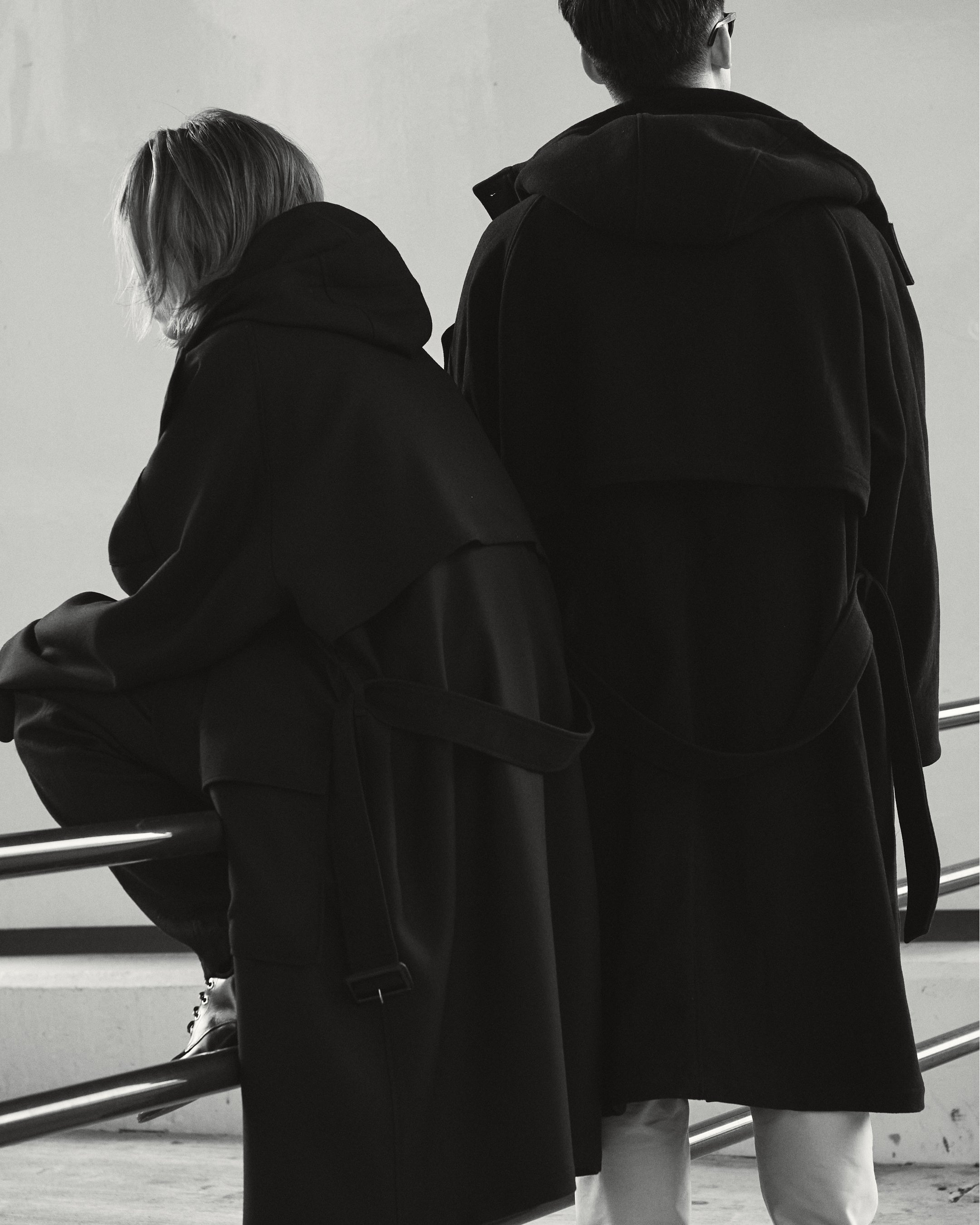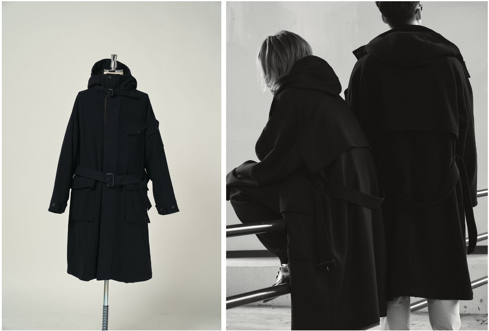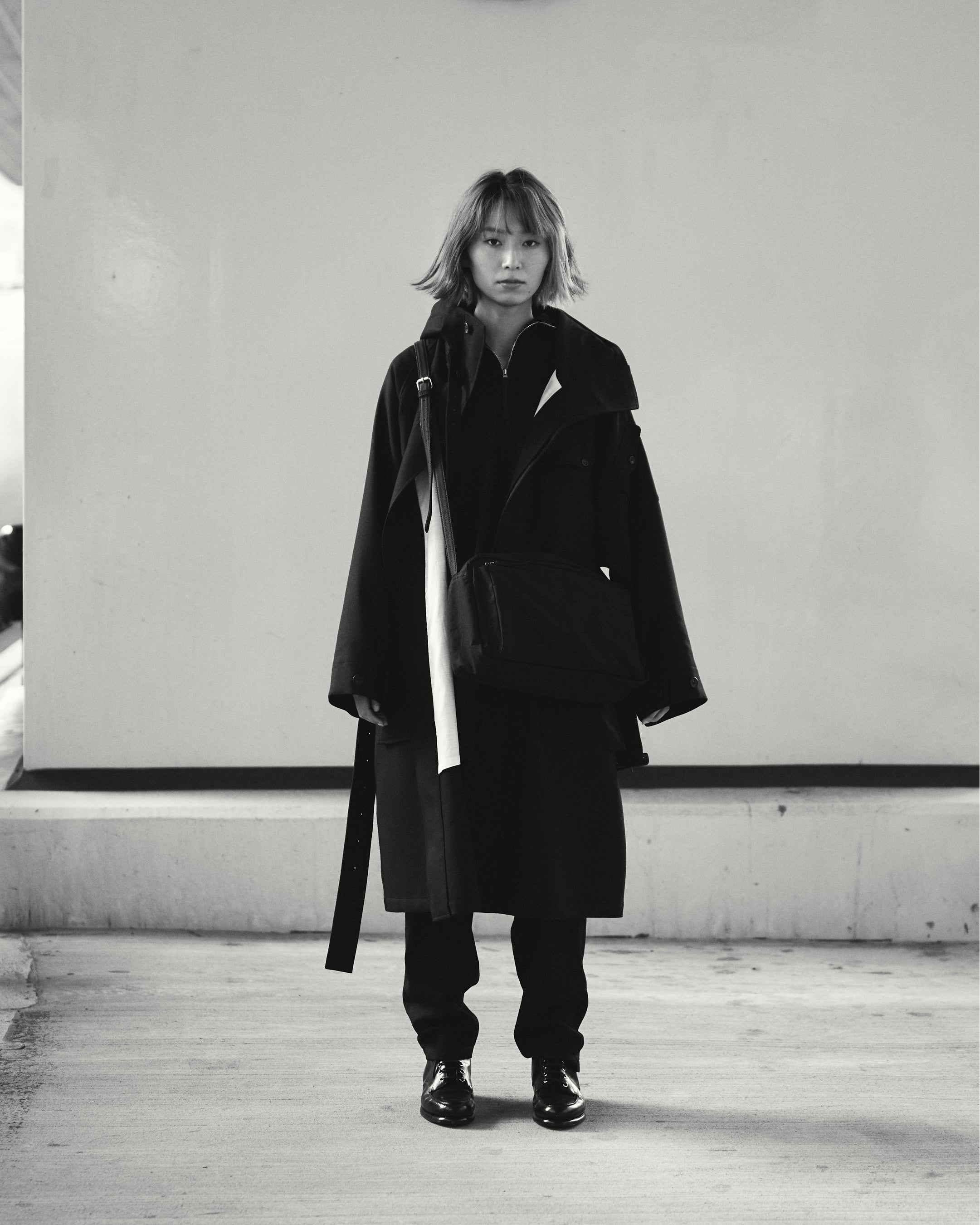 ”MATERIAL GEEK”として業界内の異名を持つ藤内。たっぷりとした分量感を持つ、独自ルートで開発したウール素材2種を、生地の面白さを存分に生かすシングルベルテッドコートに落とし込みました。