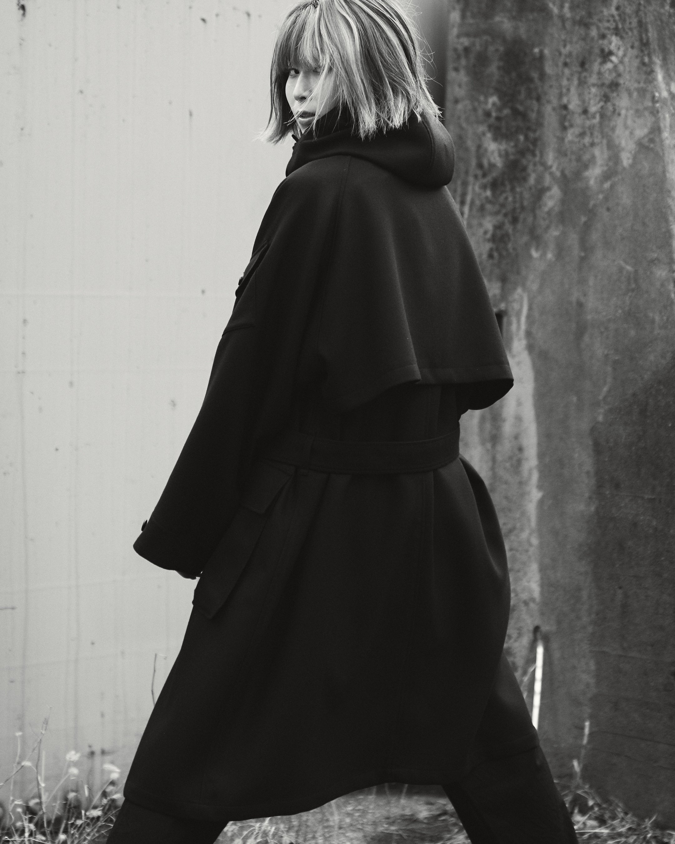 たっぷりとした分量感を持つ一重仕立てのウールコート。フード裏と下前立てのカーキのアクセントカラーがポイント。最適な位置に配置した袖のポケットと胸ポケットにスマートフォンやカードケースを、大きめな腰ポケットにはロングウォレットも収納可能。フードとウエストの共ベルトでシルエットをアレンジ。釦は本水牛、共ベルトはレザーのクルミバックル。