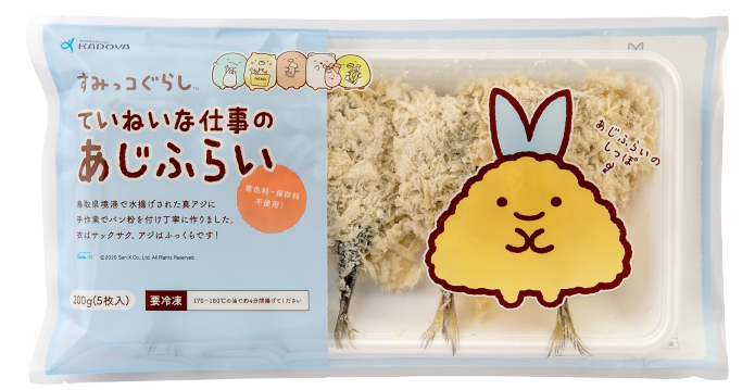 2021年4月に初めて、すみっコぐらし™とのコラボレーション商品として あじふらいのしっぽをパッケージに大きくあしらった、『ていねいな仕事のあじふらい』を発売しました。