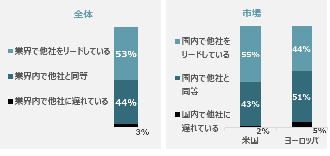 地域別に比較したところ、同業他社より進んでいるAI導入が進んでいるかという質問について、欧州の組織では55%であったのに対し、米国の組織は44%であることが分かりました。