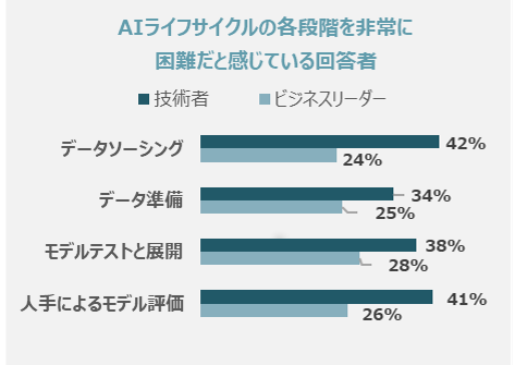 - 技術者の42%がAIライフサイクルのデータソーシングの段階は非常に困難であると回答