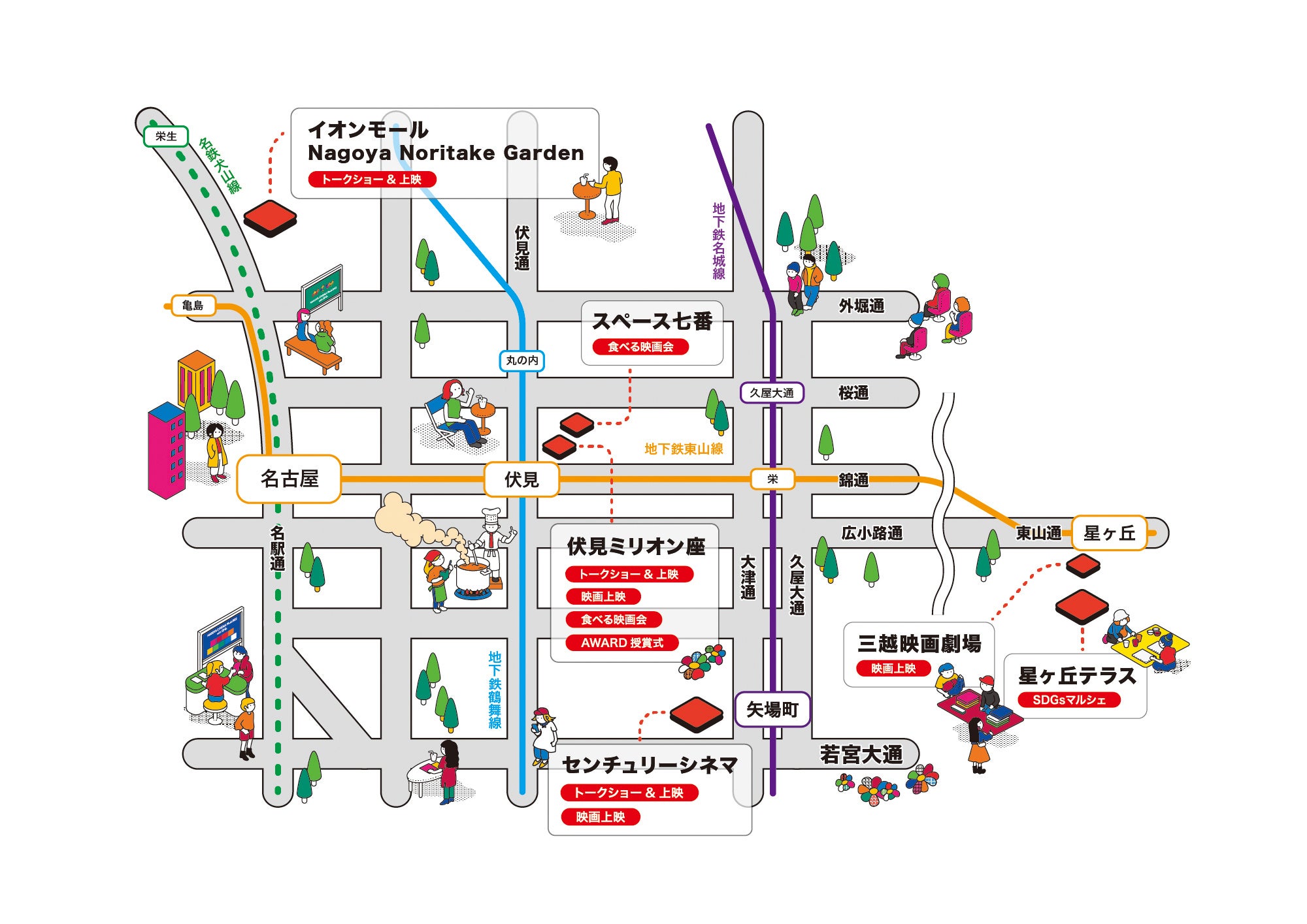 会期中は、「伏見ミリオン座」、「センチュリーシネマ」をメイン会場とし、「イオンモールNagoya Noritake Garden」「三越映画劇場」「星が丘テラス」「スペース七番」の4つのサテライト会場で、年齢・性別・障がい・人種・民族・格差・宗教を超えて感動を分かち合うことのできる11作品を上映する他、映画とSDGsを核とした様々なイベントを開催します。