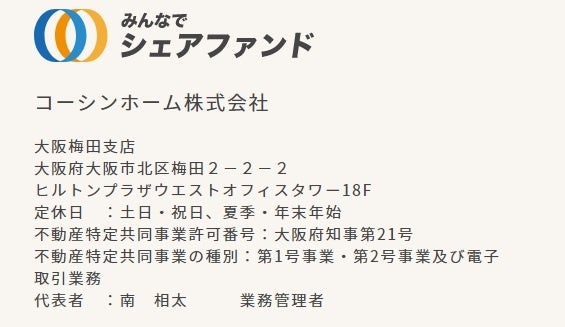 コーシンホーム株式会社(本店:堺市東区、 代表取締役:南相太、 以下「コーシンホーム」)は、2022年10月13日に不動産特定共同事業の許可を取得しました。コーシンホームが運営する【みんなでシェアファンド】は、不動産特定共同事業法(国土交通省管轄)にもとづく不動産クラウドファンディングです。