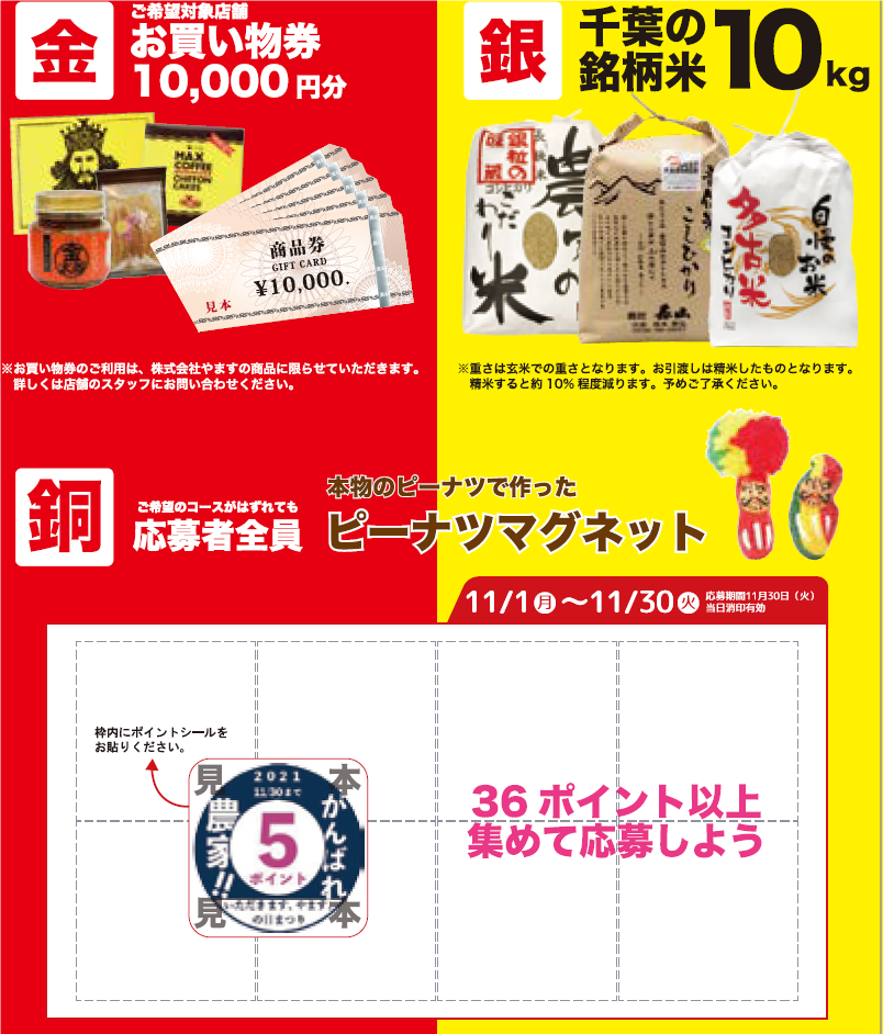 房の駅などに設置されている応募用紙に、落花生商品についているポイントシールを貼って応募すると、抽選で千葉の落花生や房の駅などで利用できるお買物券が当たります。また応募者全員に本物の落花生の殻で作ったピーナツマグネットをもれなくプレゼントします。