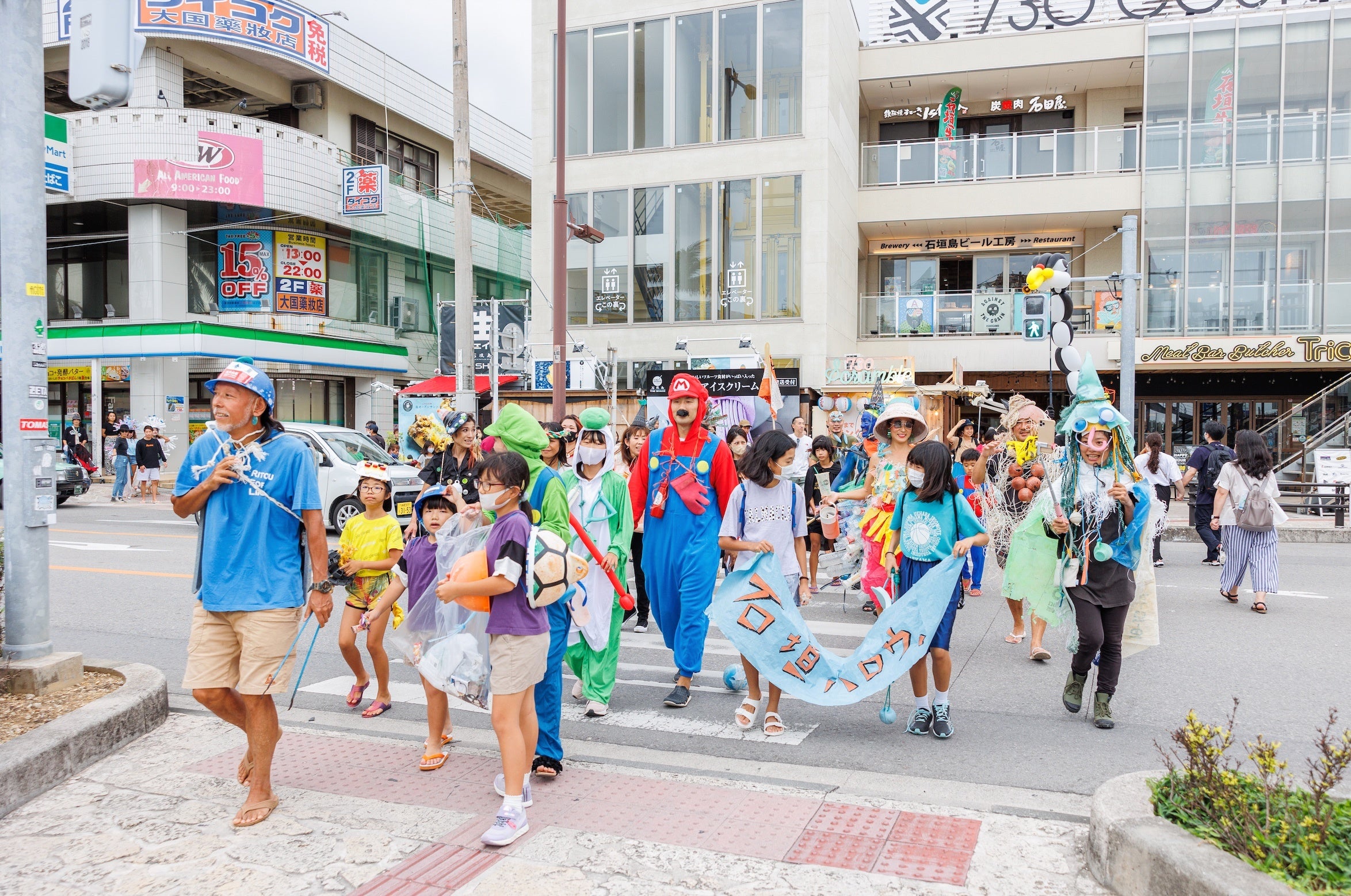 パレードでは石垣島のコワーキングカフェ&ホテル《しまのとき》を起点に石垣島のメインストリートであるユーグレナモール〜730交差点を経由し、美崎町を海洋ゴミを纏った約60名のおばけ達がゴミ拾いをしながら練り歩きました。