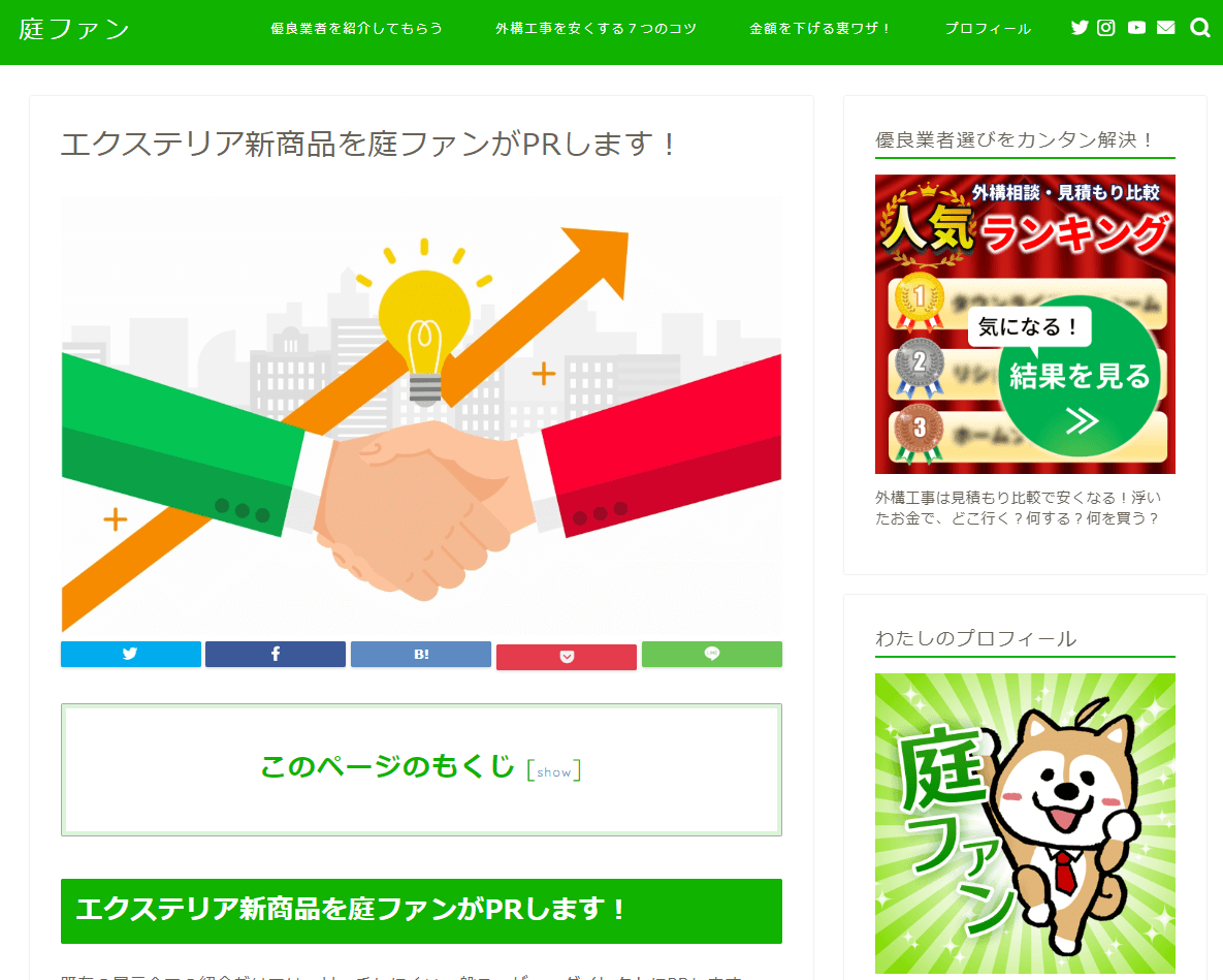 株式会社庭ファンは、新築外構・エクステリア工事を賢く・安くできる情報を配信するエクステリア外構メディアサイトを運営しています。外構業者さん選びから商品選定まで、無料相談も受付しています。お得に正しくプランを検討するための情報をブログ・YouTube・Instagramを通じて解説しています。