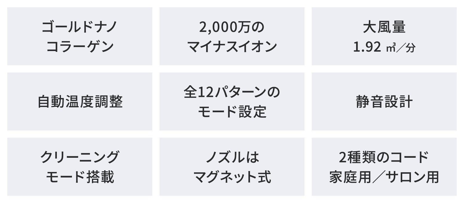 2000万のマイナスイオンが髪のキューティクルを痛みから保護し、髪にうるおいとツヤを与えます。まるでうるおいを浴びる様な感覚を是非、お試しください!