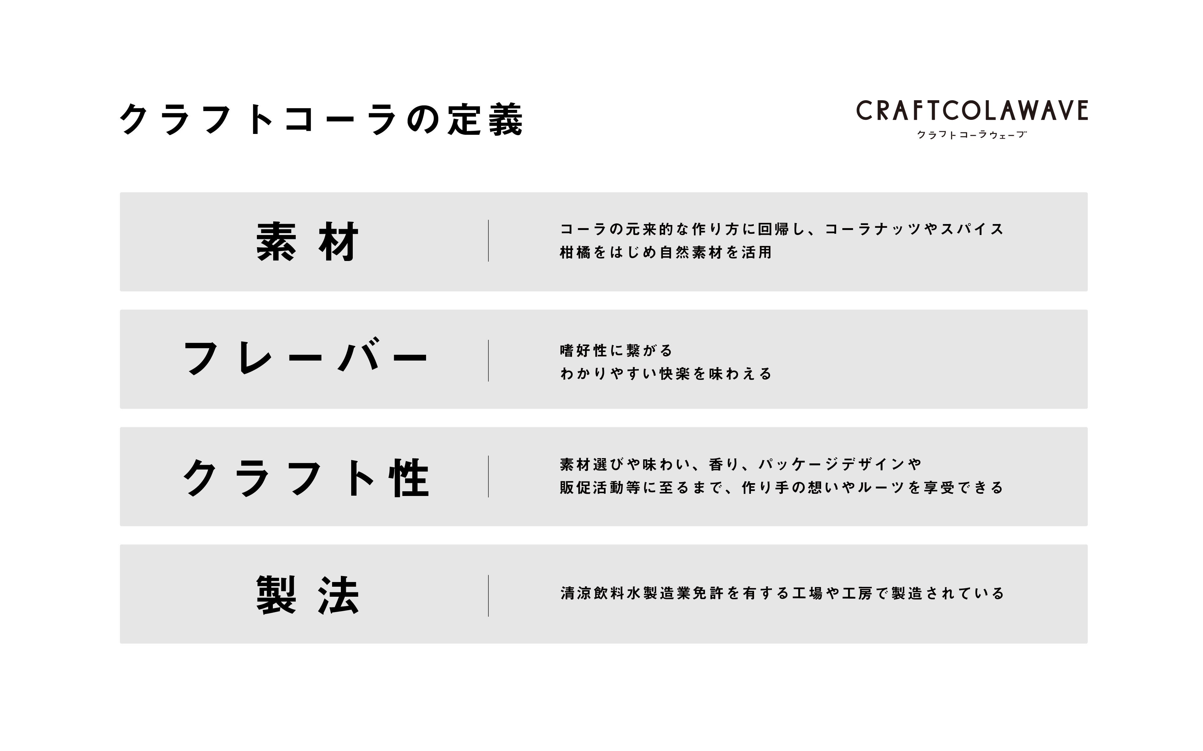 まとめると、クラフトコーラは「コーラの元来的な作り方に回帰し、コーラナッツやスパイス、柑橘をはじめ自然素材を活用することに加え、素材選びや味わい、香り、パッケージデザインや販促活動等に至るまで作り手の想いやルーツを享受できるコーラ」と解釈できます。