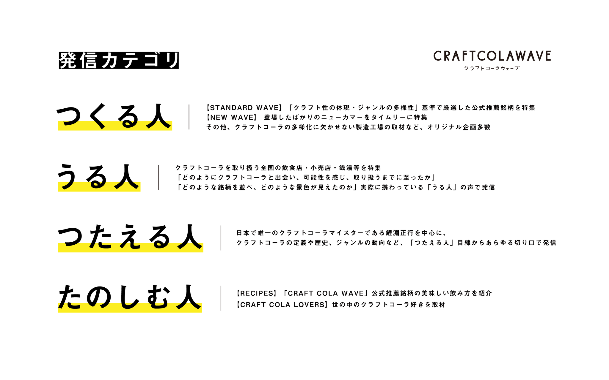 クラフトコーラカルチャーを「つくる人」「うる人」「つたえる人」「たのしむ人」の声で映しだす。公式発信基地「CRAFT COLA WAVE」創設